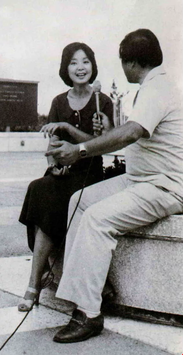 Teresa Teng being interviewed by a U.S. television reporter before she holds a concert.