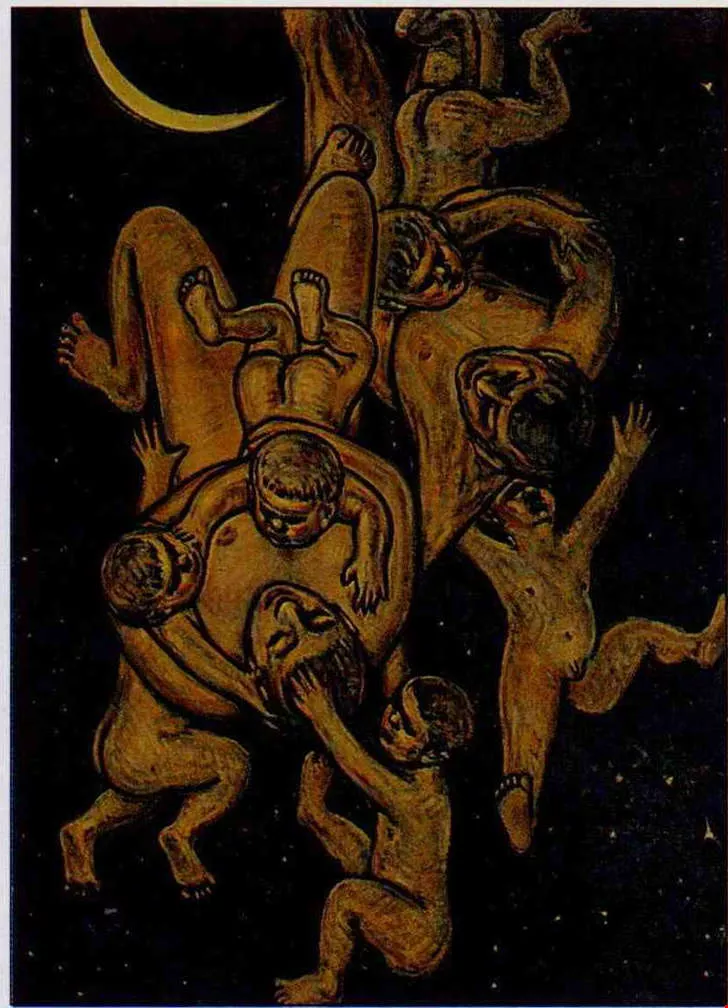 Ho Te-lai's "The Overburdened Earth" is not just a reflection on overpopulation, but also on human ambition. (photo courtesy of Taipei Fine Arts Museum) Oil on canvas, 145×112, 1950