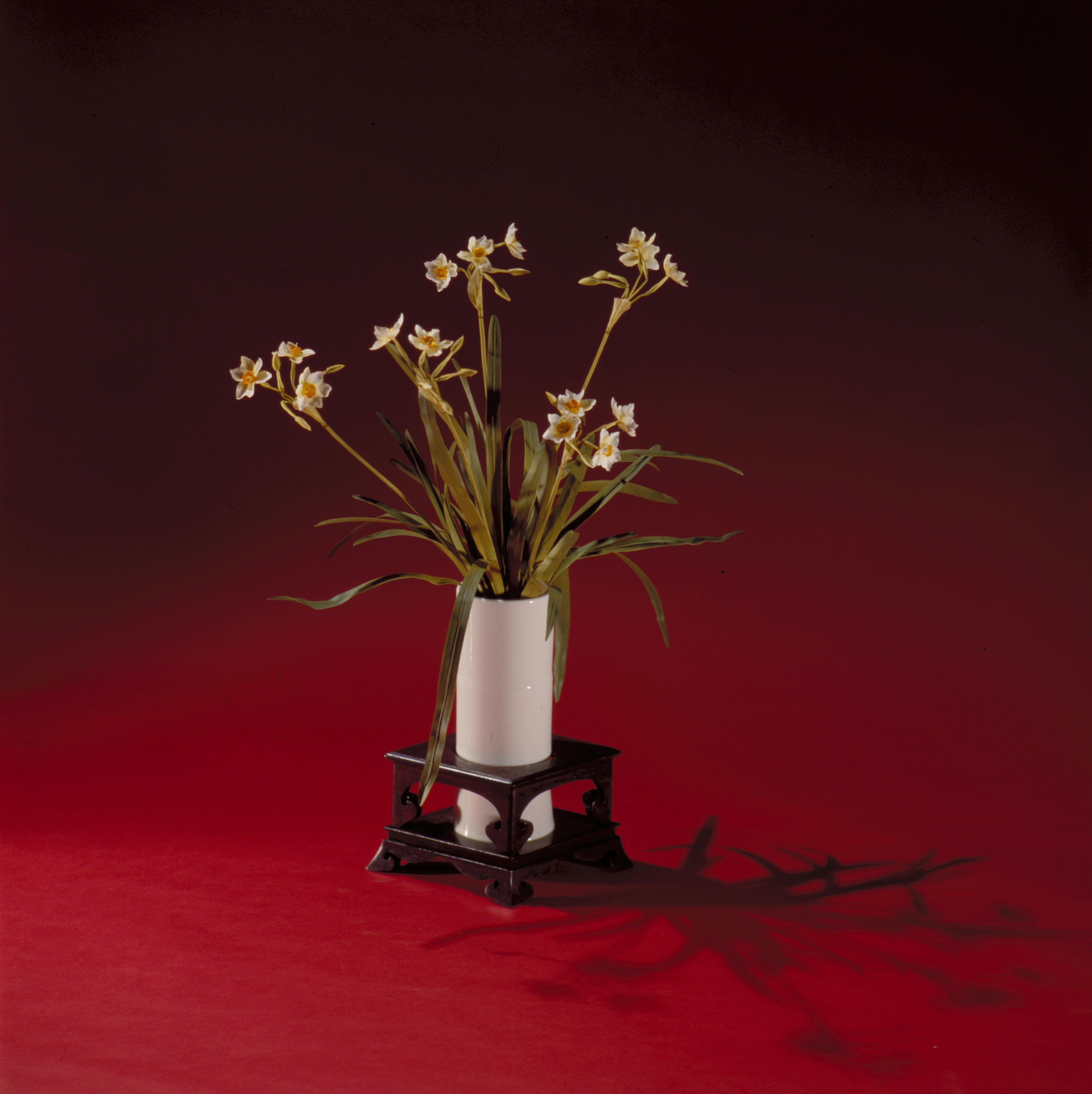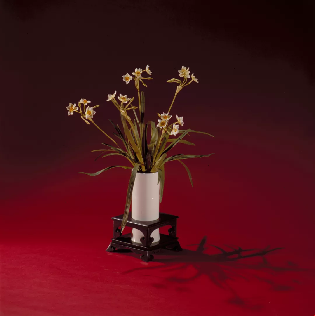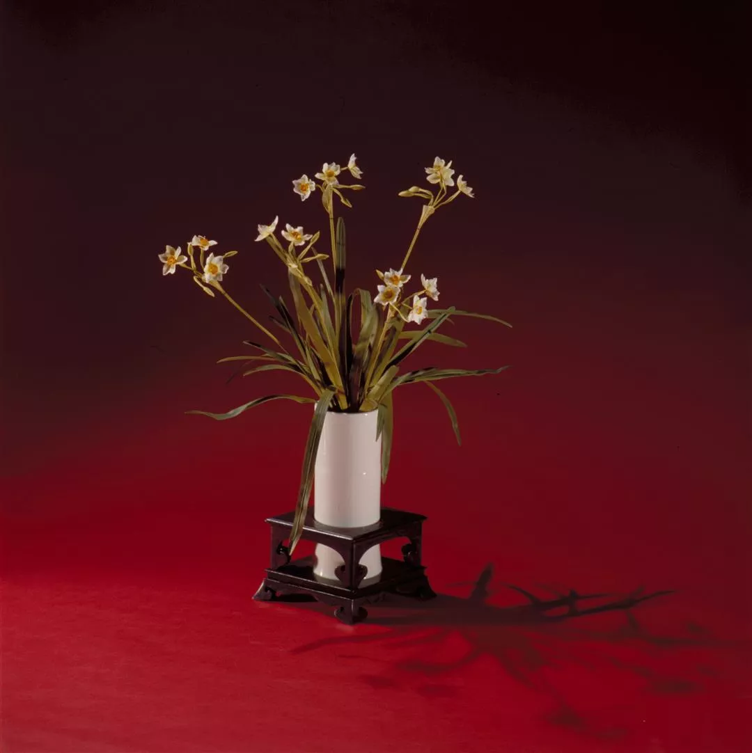 5. A beautiful arrangement of narcissus in a white porcelain vase set on a carved wooden stand.