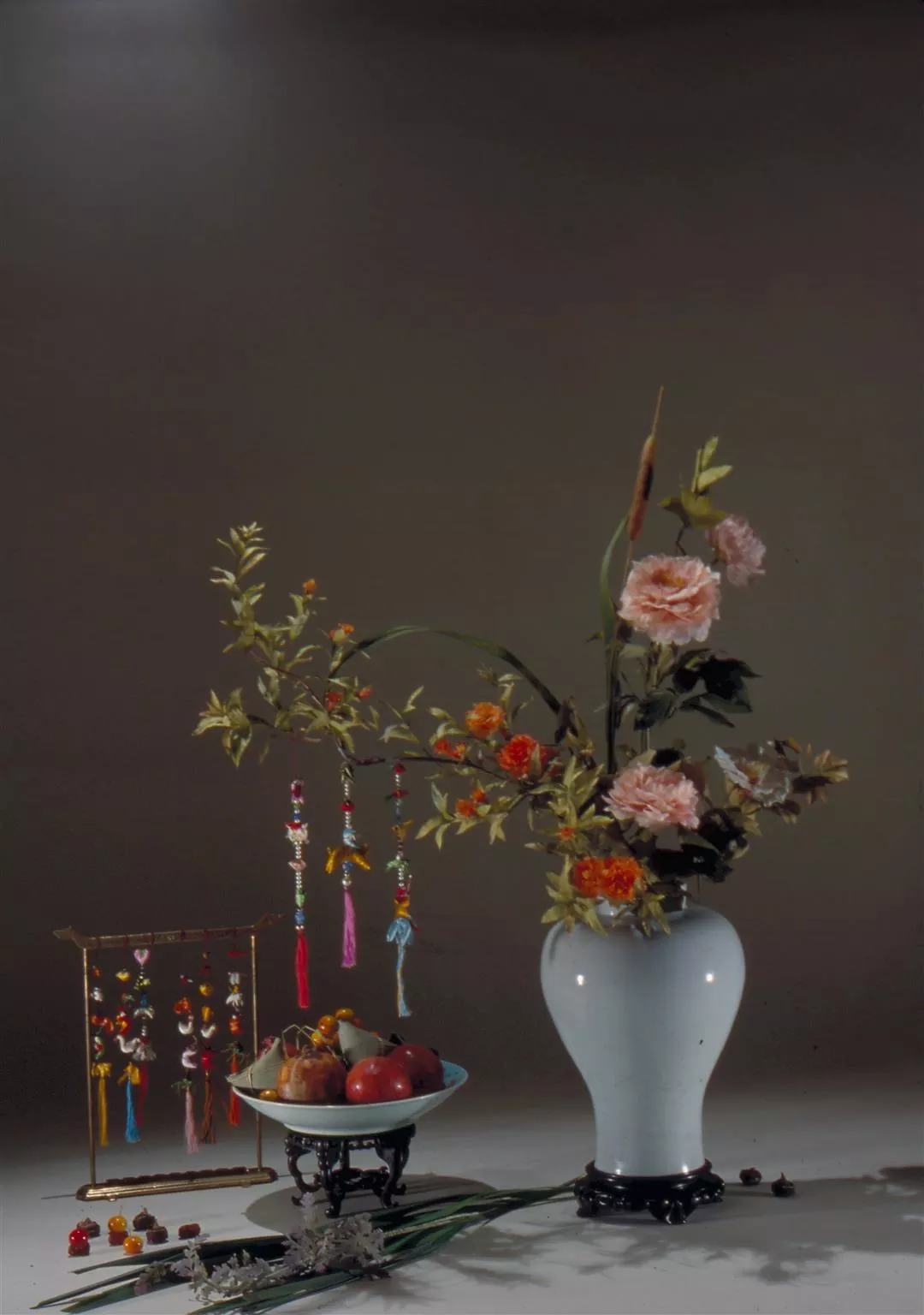 1. The displays utilized traditional Chinese home decorations such as fan-shaped windows and moon doors. 2. This flower arrangement for the Dragon Boat Festival is replete with holiday symbols of good fortune. 3. A basket of summer blooms is highlighted by June's lotus blossom.