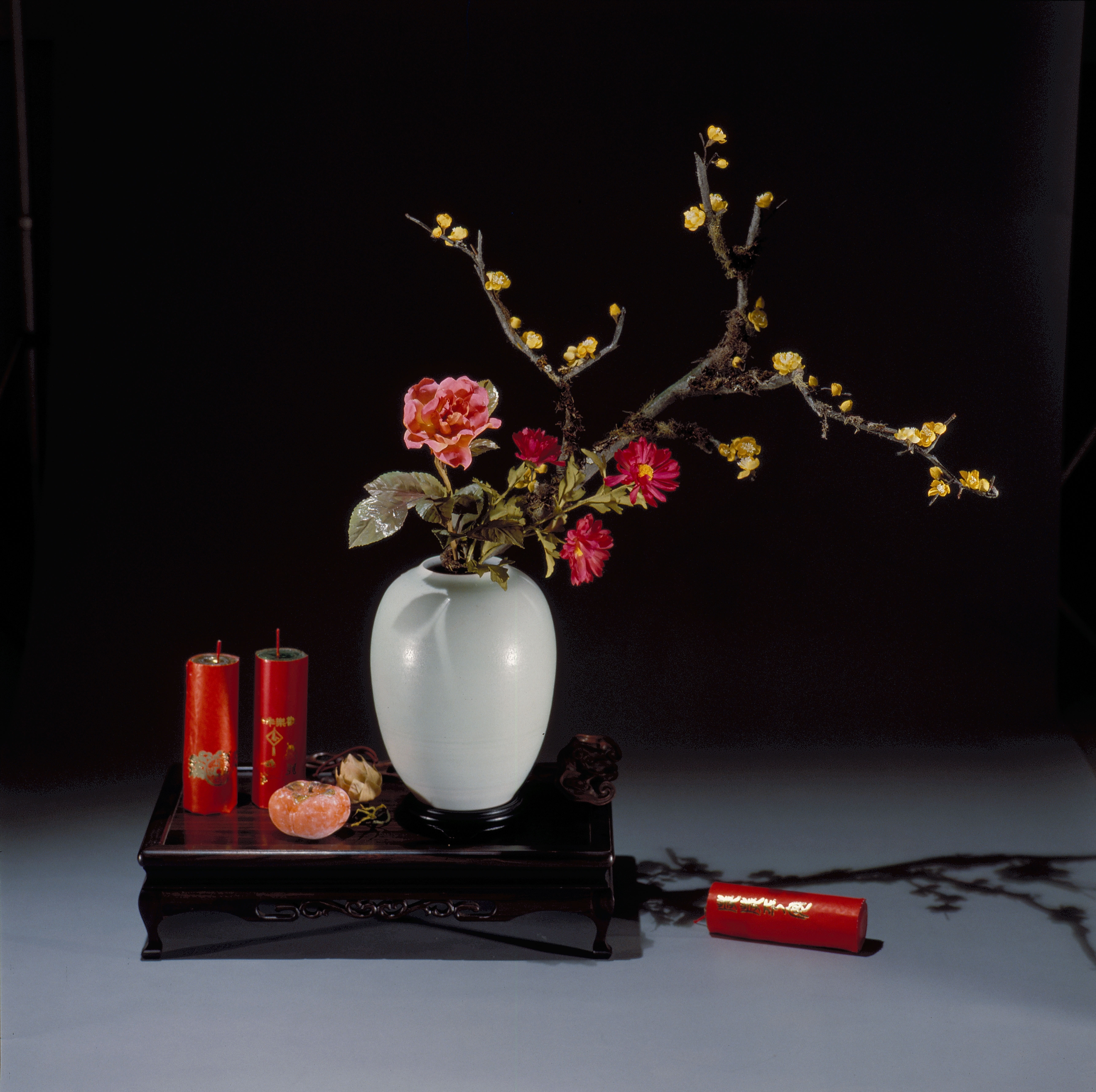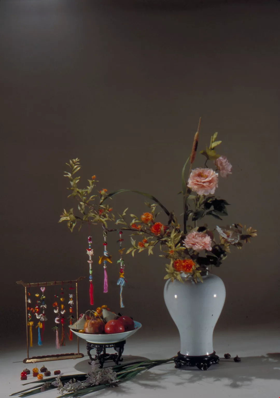 Folk flower arrangements reflected seasonal and holiday variations. Scenes embellished by lanterns, scrolls, screens and vase stands, displayed flower arrangements signifying luck and prosperity. Whether on a table, the floor, or at the doorway, flowers were always a decorative presence in the Chinese home.