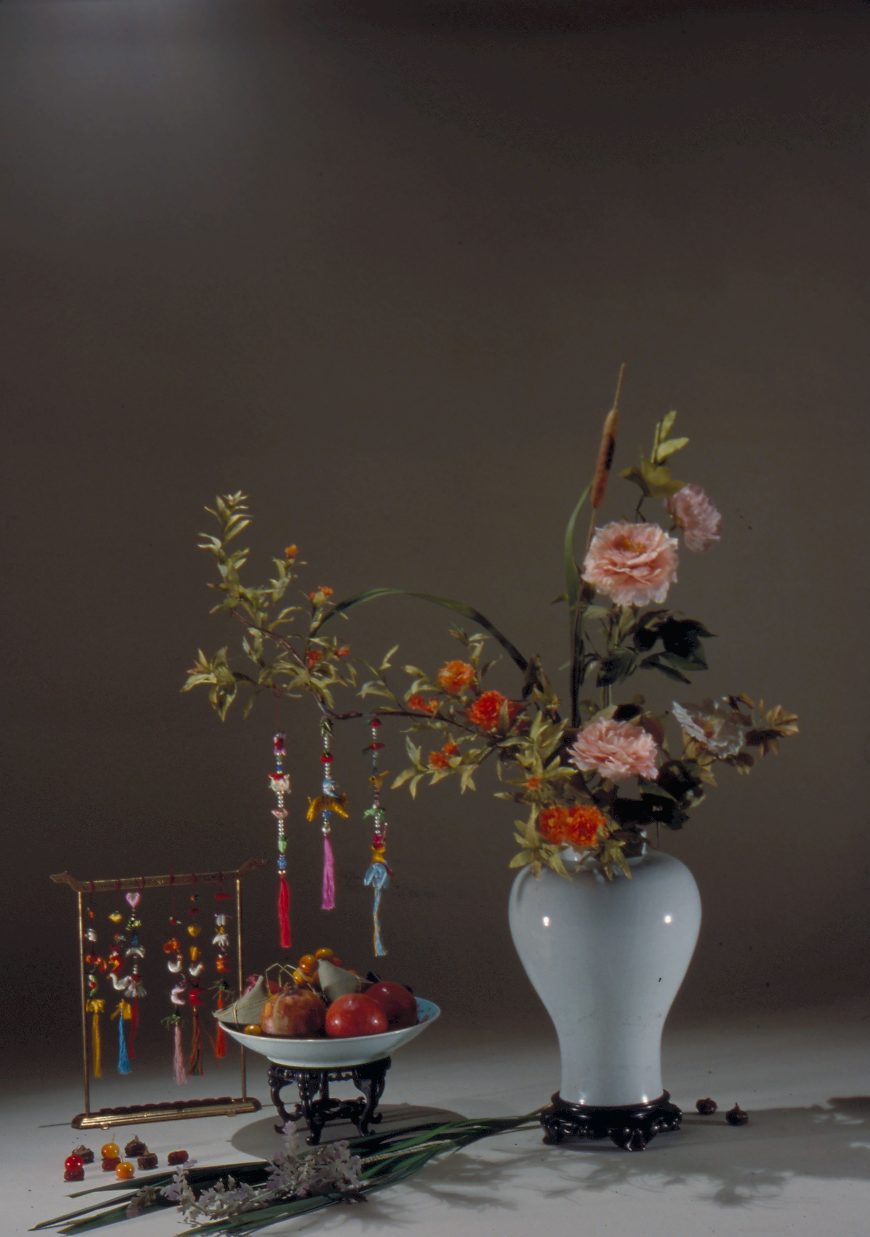 2. This flower arrangement for the Dragon Boat Festival is replete with holiday symbols of good fortune.