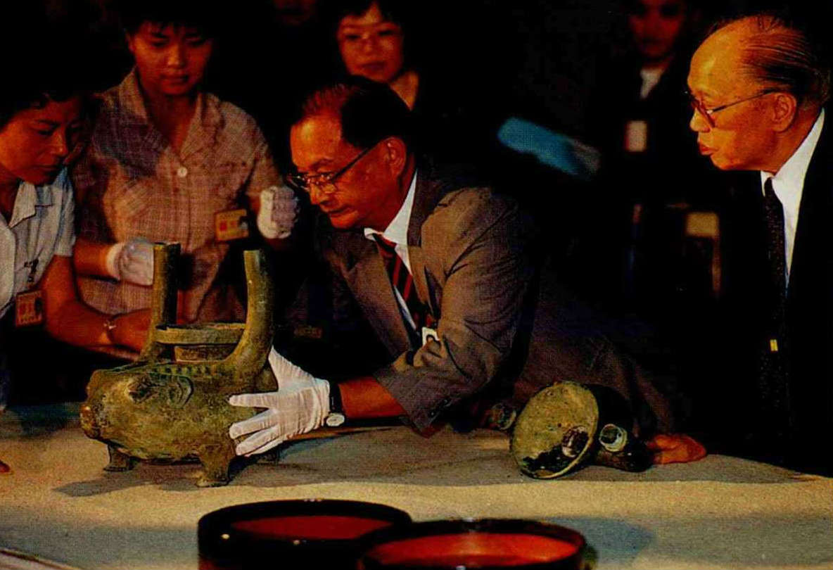 National Palace Museum director Chin Hsiao-yi (right), hosting a press conference for the museum's latest major exhibit. Chang Kuang-yuan, head of the artifacts department, shows off this zero-pollution lamp at the event. (photo by Pu Hua-chih)
