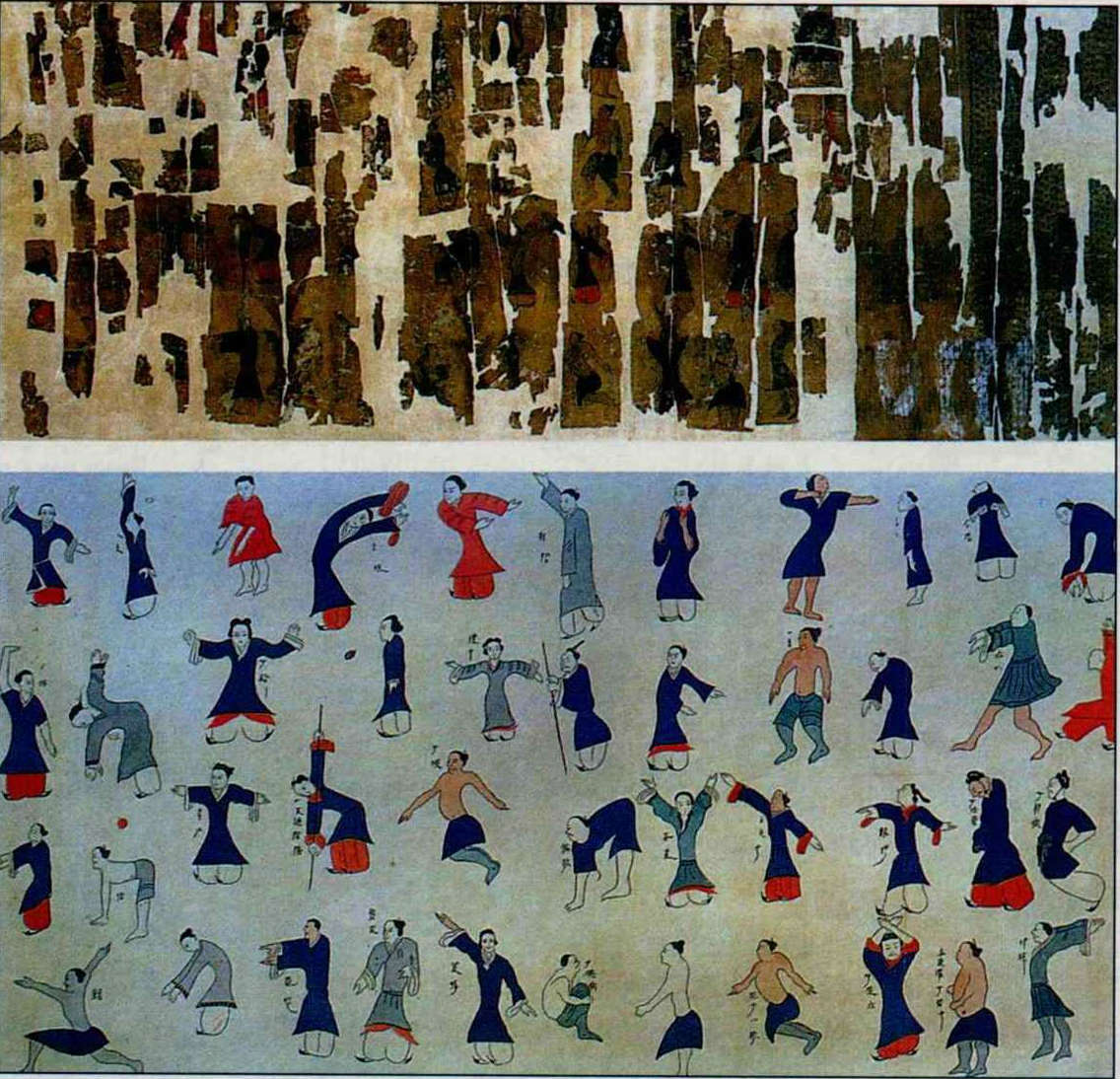 This painted manuscript from Mawangdui depicts a scene that looks very similar to what you'll find early in the morning at any Taipei park, with people doing their morning exercises everywhere. Take a closer look-do you recognize any of the qigong exercises?