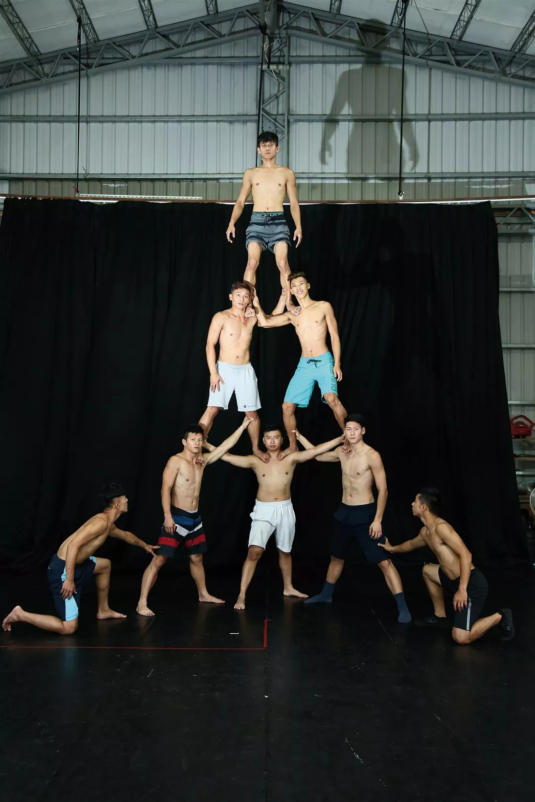 Eight troupe members demonstrate a three-tier human pyramid. (photo by Jimmy Lin)