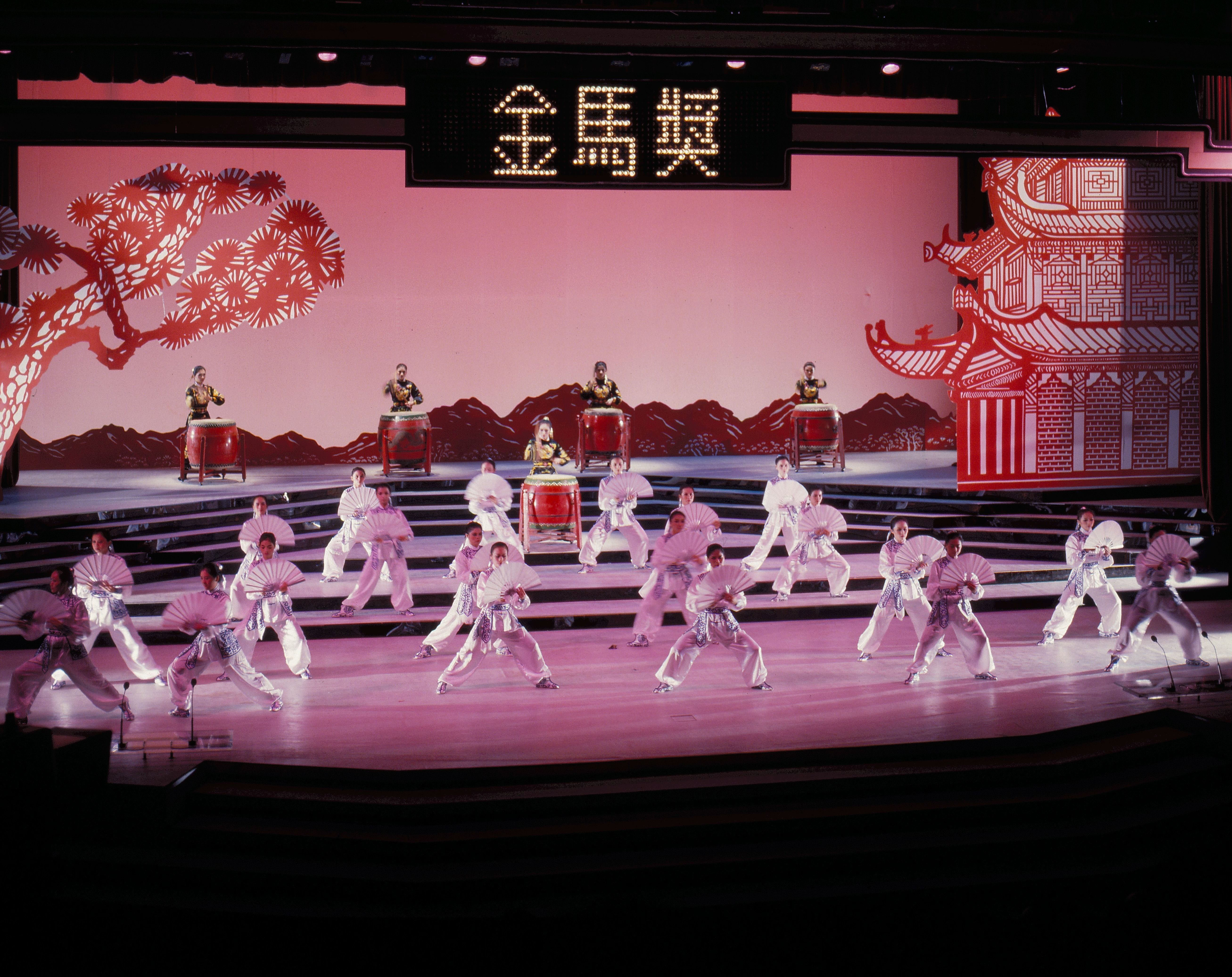 1. Dr. James Soong, Director General of the GIO, sitting with his wife in the audience before getting up to give his speech. 2. This year's simple set was highly praised. 3. The host and hostess, Chiang Kuang-chao and Teresa Hu. 4. A performance of Chinese folk dance.