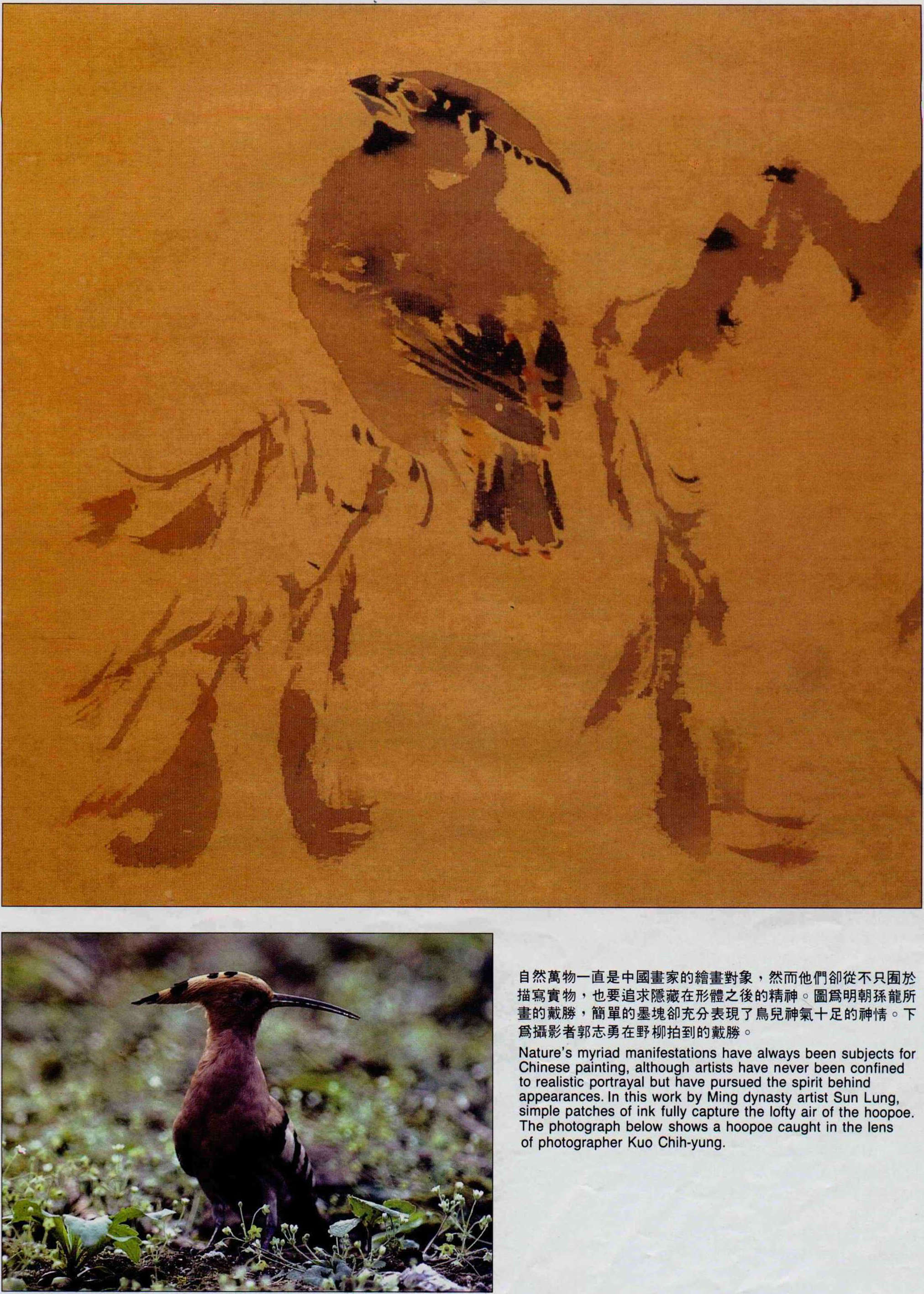 Nature's myriad manifestations have always been subjects for Chinses painting, although artists have never been confined to realistic portrayal but have pursued the spirit behind appearances. In this work by Ming dynasty artist Sun Lung, simple patches of ink fully capture the lofty air of the hoopoe. The photograph below shows a hoopoe caught in the lens of photographer Kuo Chih-yung.