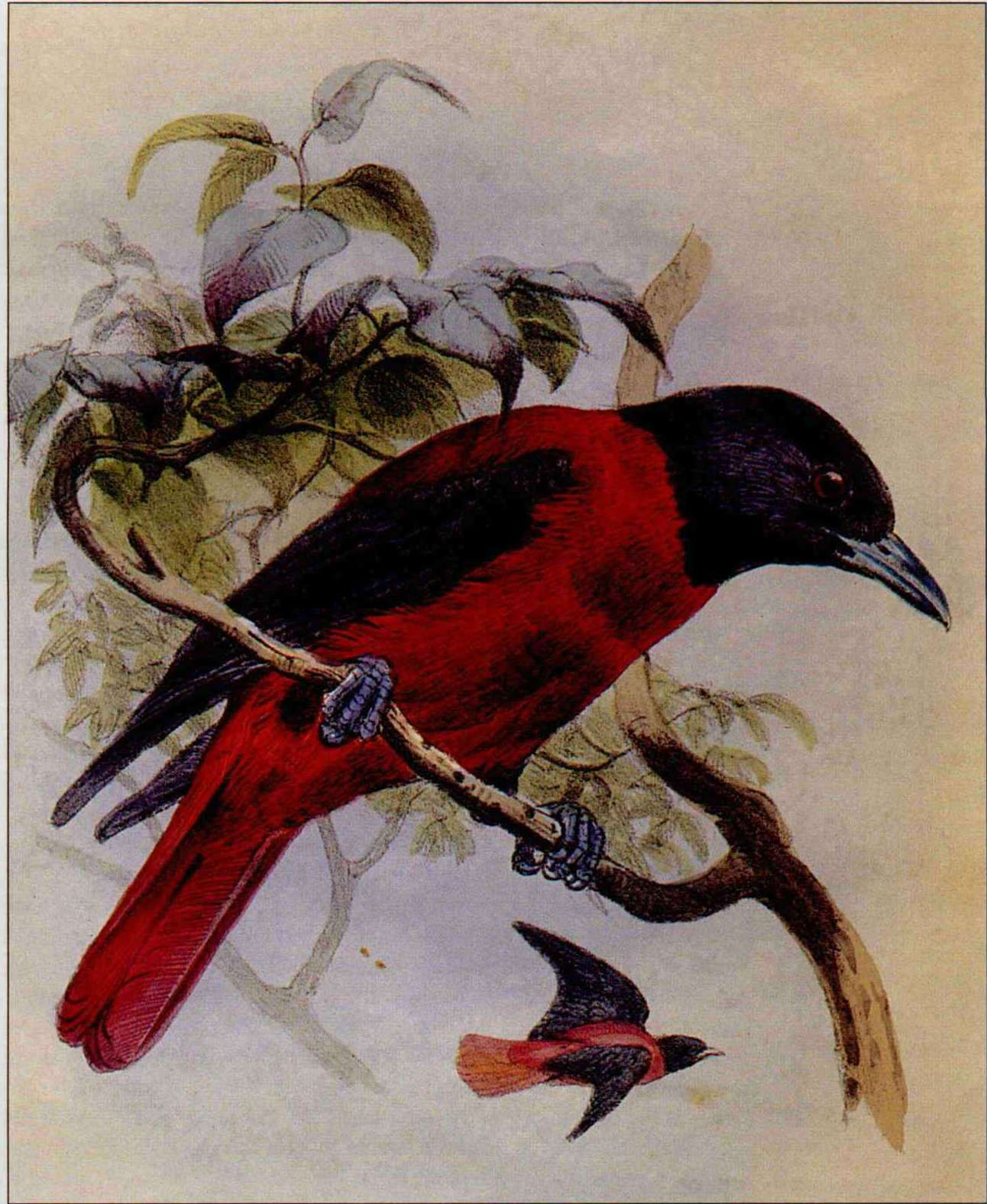 (Above)The maroon oriole painted by the nineteenth century German artist Wolf appeared in the English ornithological journal /bis. The modern style of painting wild birds began with depictions by Western painters of the flora and fauna collected by biologists from all over the world.