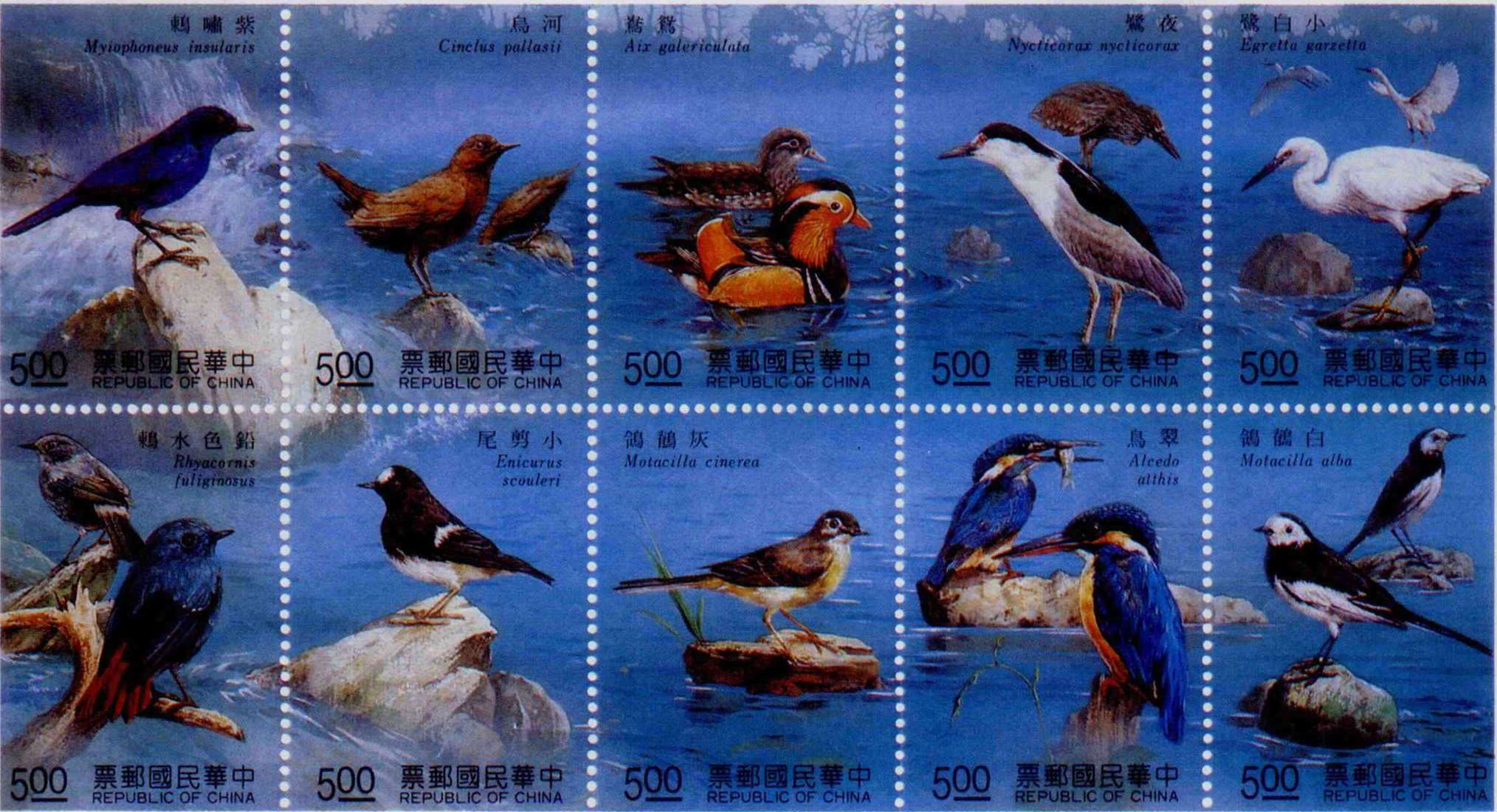(Below)Two years ago, the issue of stamps by the Chinese Postal Museum showing the wild bird species of Taiwan's mountain streams by Yang En-sheng was widely welcomed. The challenge for artists wanting to unify art and acience is a big one.(courtesy of the Chinese Postal Museum)