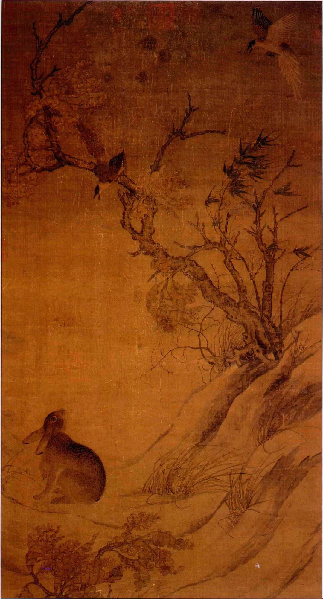 Lin Po-ting takes the Northern Sung artist Tsui Pai's Double Happiness as an example of art of both superseding appearances and catching the tone of the myriad things of nature. In this work, two magpies face off a hare that has crossed their territory; the birds stretch out their wings to scare the hare, their feathers ruffled by the wind; the hare turns in astonishment with a look of bewilderment, its body pliant with a realistic softness that makes you want to stretch out your hand and stroke it. Looking at what has been recorded today about the magpie, it is in fact a bird that defends its territory very fiercely.