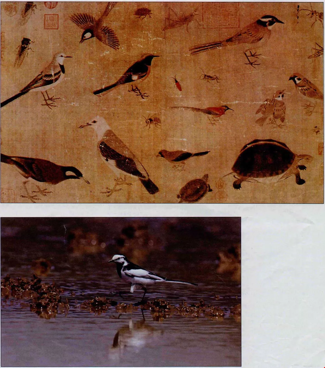 Huang Chuan's scroll of rare species painted from life features birds the names of which today's bird watchers can call out with ease. To the left and center of the picture can be seen the migratory white wagtail which passes through Taiwan every year. Below is a photograph of the white wagtail taken by photographer Kuo Chih-yung.