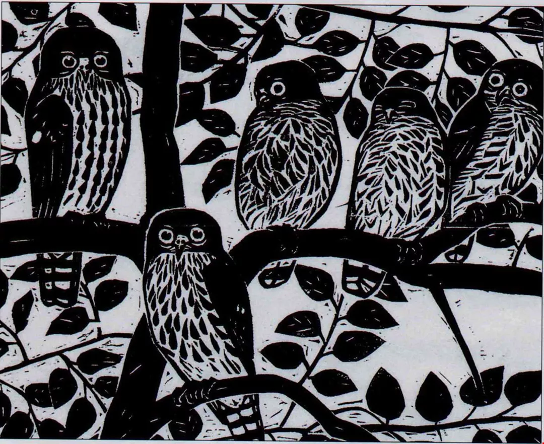 Ho Hua-jen, who held an exhibition of woodcut prints of Taiwan's birds, once left the city to travel to Liukuei and observe birds as an aid to capturing their spirit and ecology. This woodcut shows an innocent-looking wide-eyed owl in a style that is natural, simple and unexaggerated. (courtesy of Ho Hua-jen)
