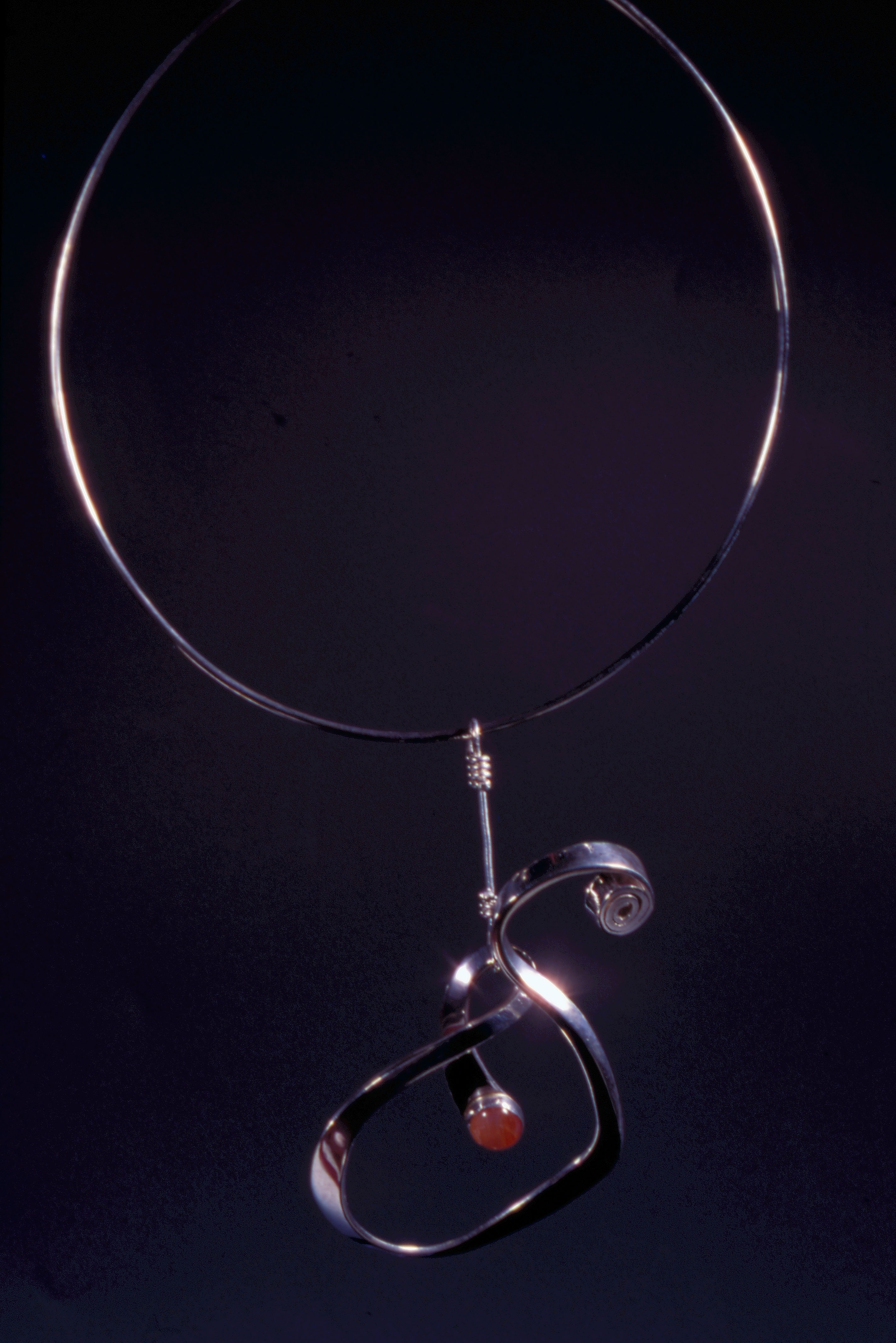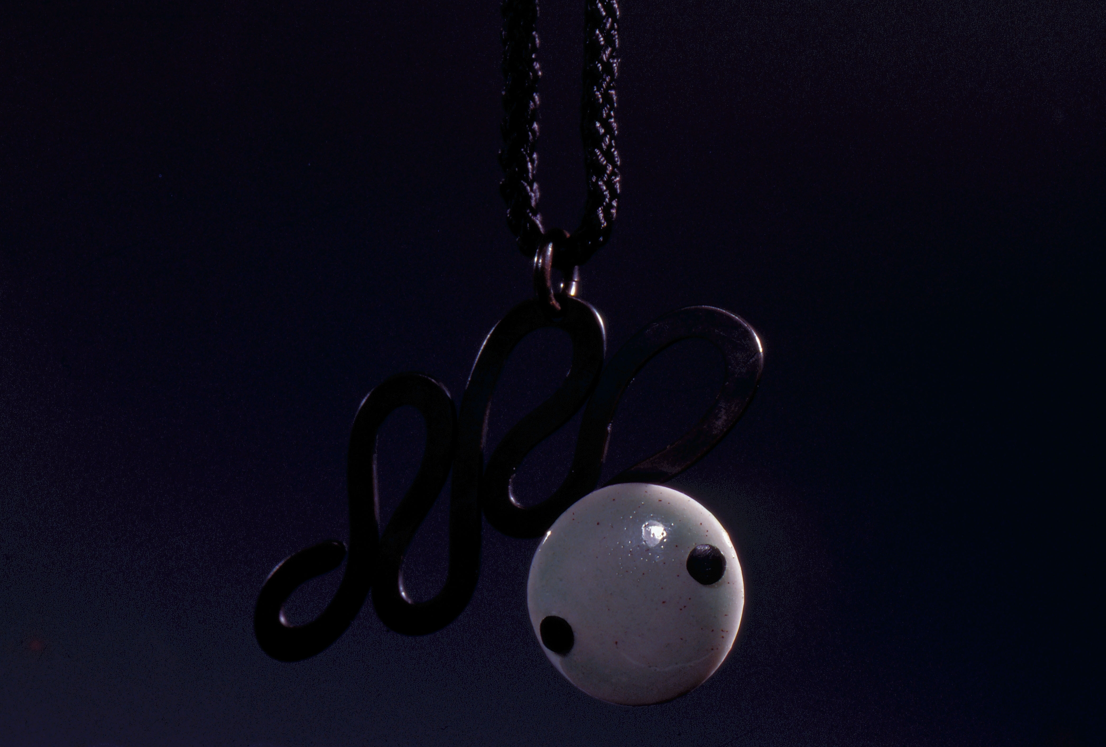 1. A ceramic ornament sets off the winding linear design of a necklace pendant. Inspiration for the piece came from a painting by Pa Ta Shan Jen. 2. A pair of uniquely welded earrings.