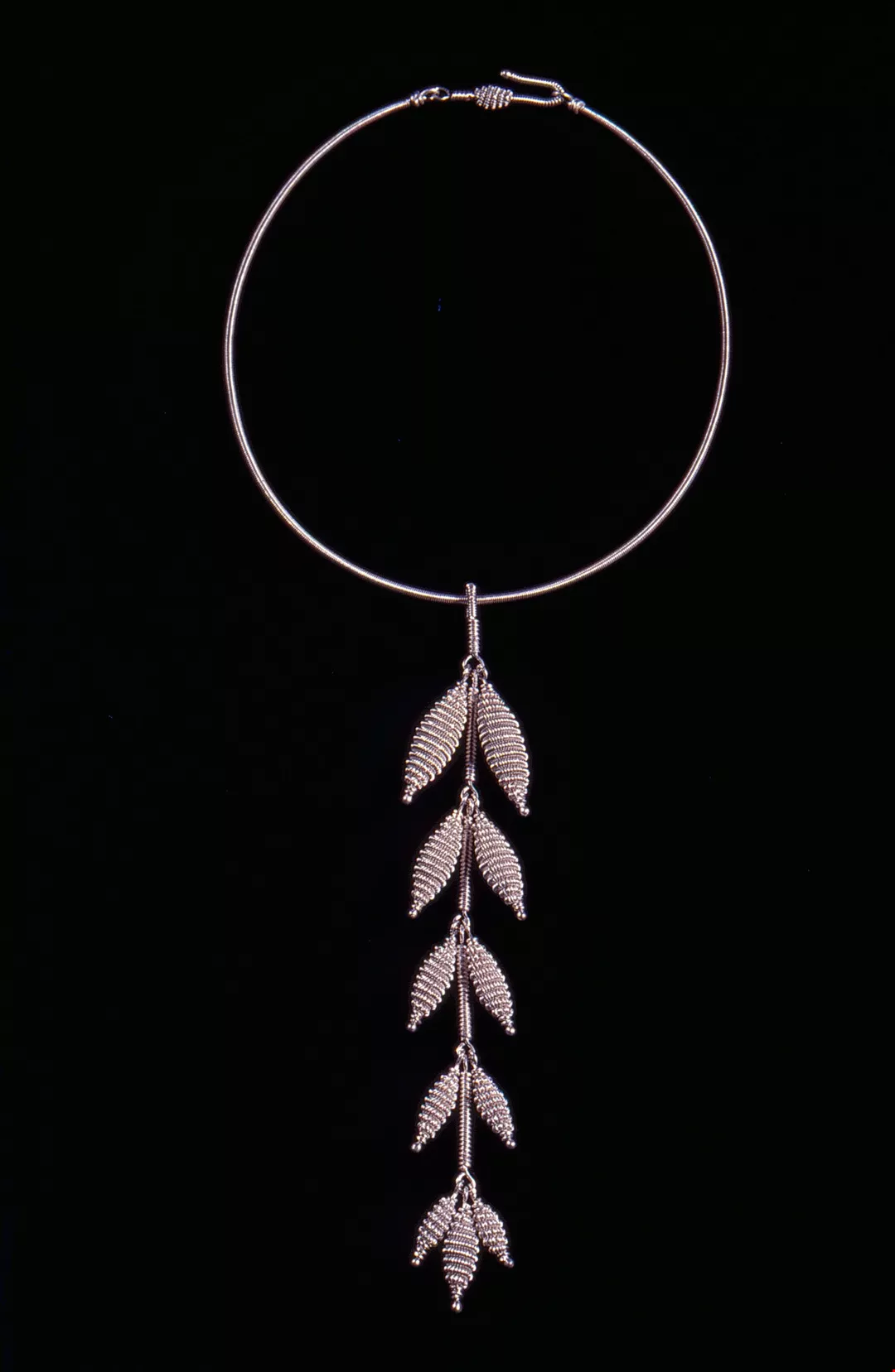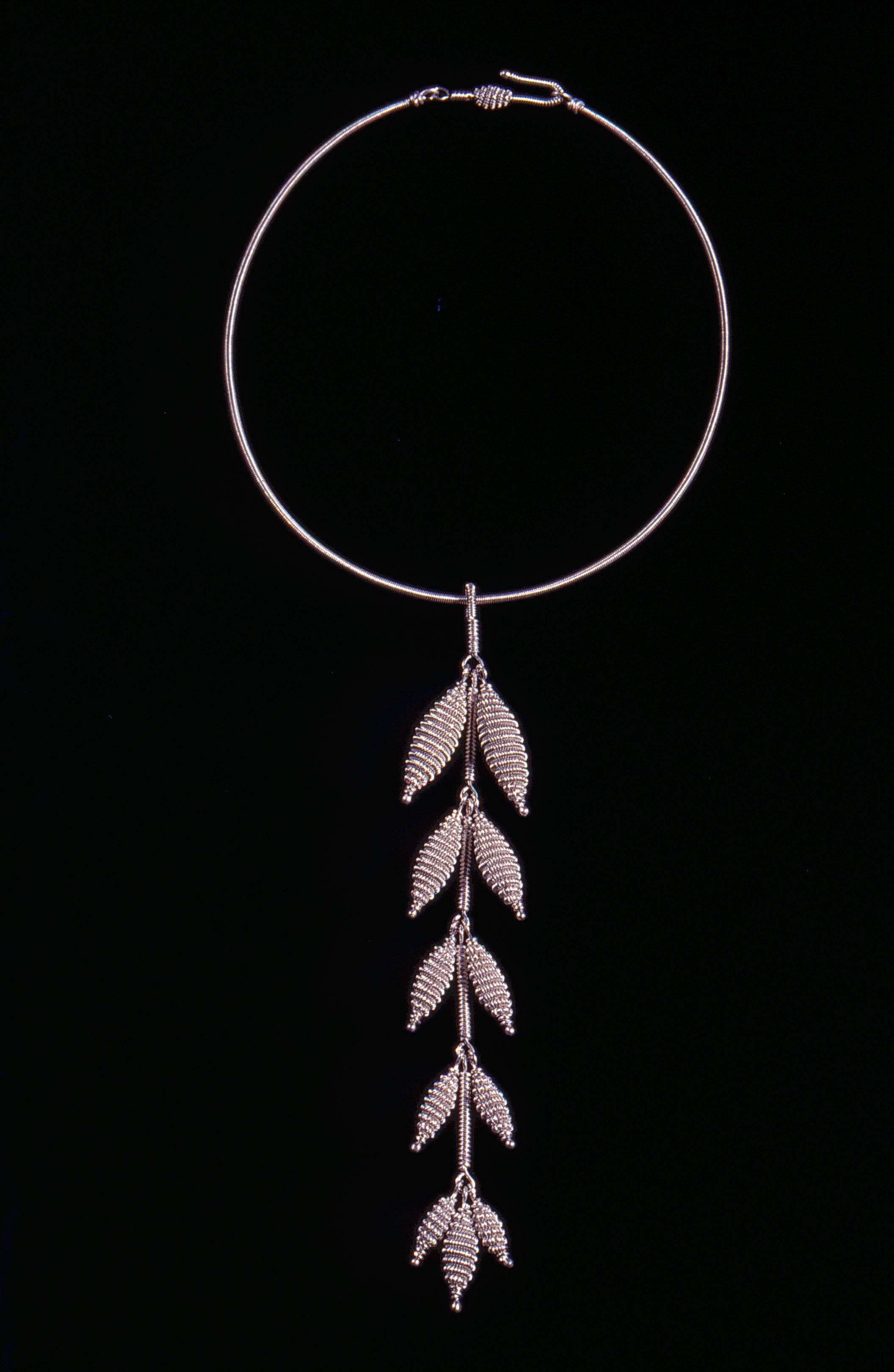 1. Leaf shapes carefully wrought out of metal wire make up a necklace design.