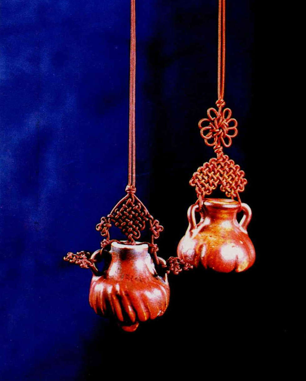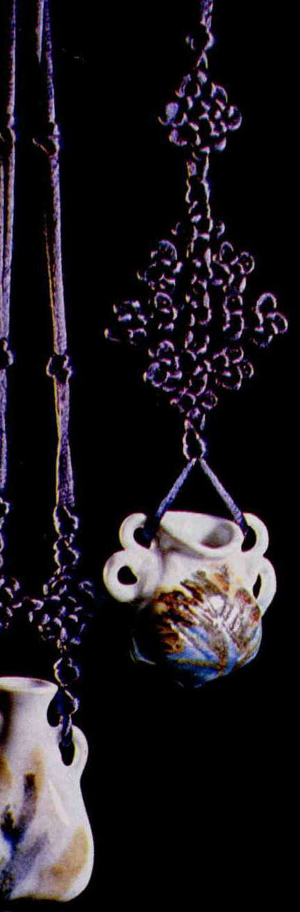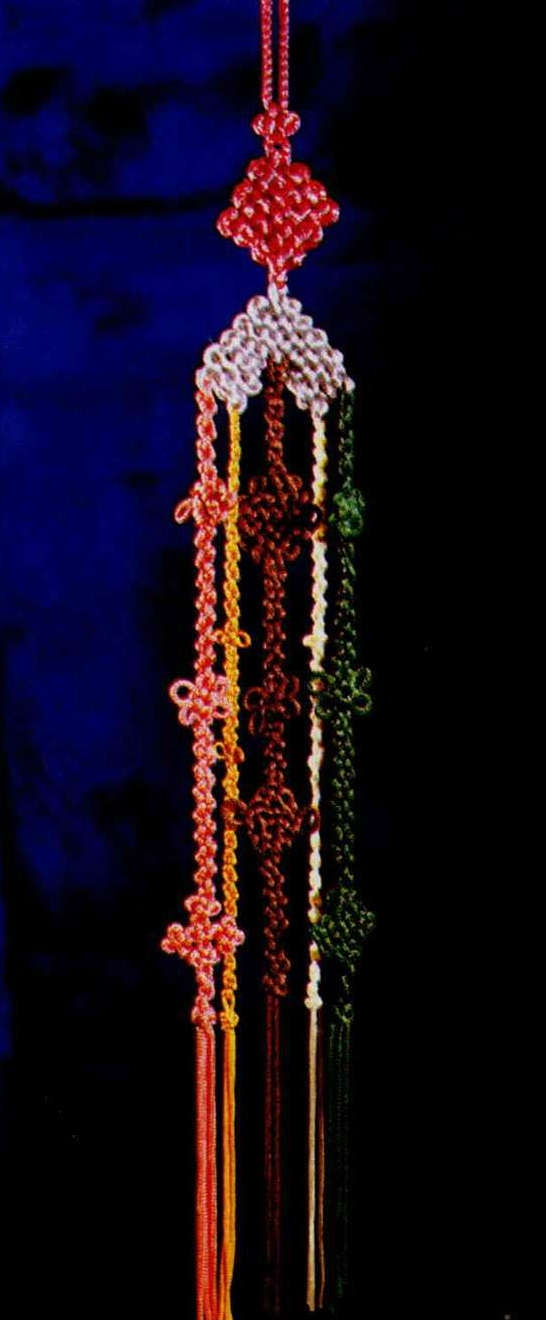 1. Delicate and beautiful Chinese macrame can be used to decorate homes. 2. 3. & 4. The beauty of earthenware is enhanced by knots in various colors. 5. Chen Hsia-sheng's Chinese macrame.