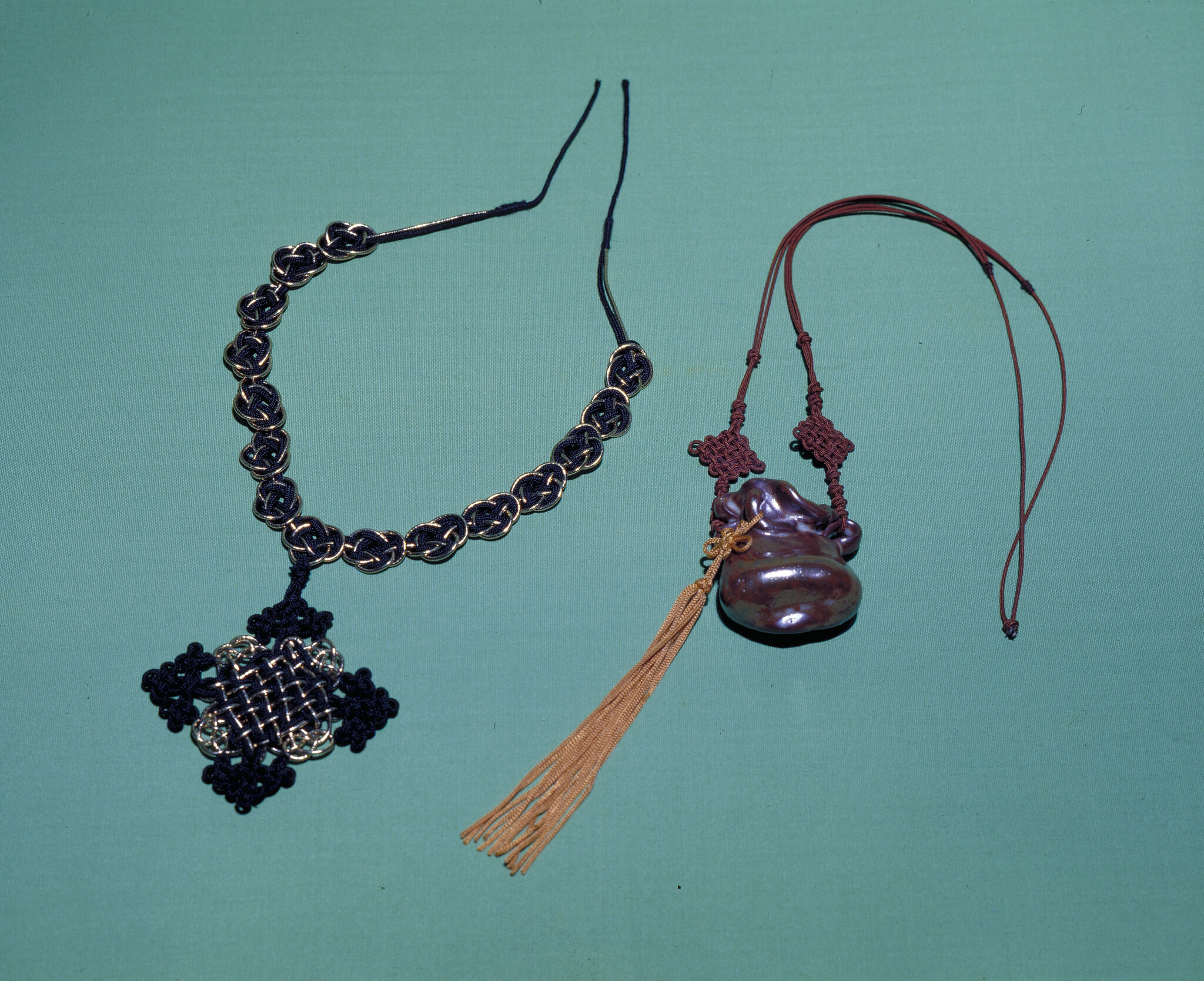 Necklaces can be made by stringing small jade pendants and other fine ornaments on to a knotted string.