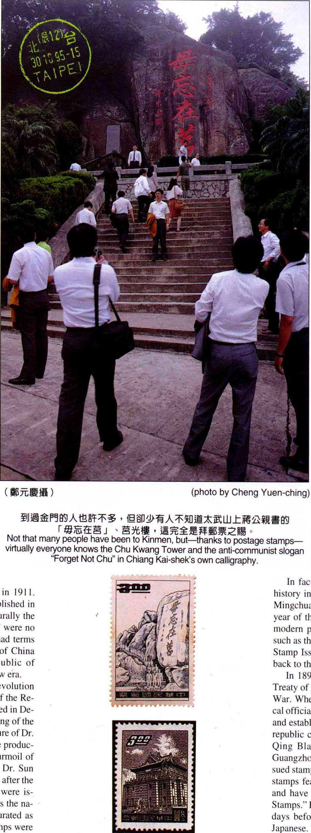 (photo by Cheng Yuen-ching)Not that many people have been to Kinmen, but--thanks to postage stamp s--virtually everyone knows the Chu Kwang Tower and the anti-communist slog an "Forget Not Chu" in Chiang Kai-shek's own calligraphy.