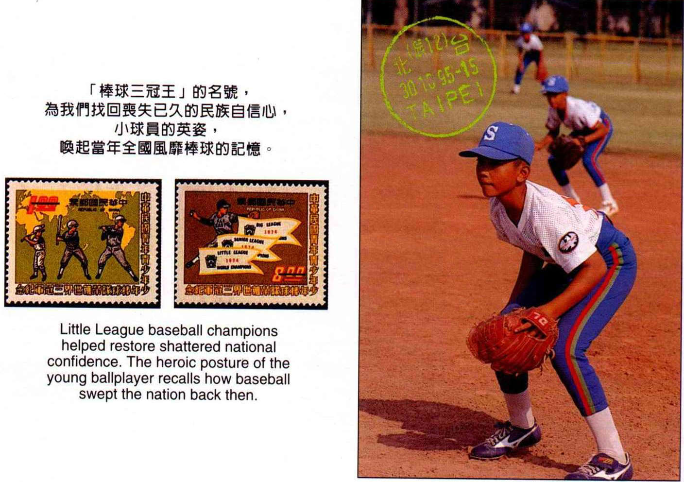 In 1971, a Little League team from Taiwan called the Giants won the 25th Little League World Series. (This was the second such title, following the success of the Golden Dragons.) The Directorate- General of Posts produced a commemorative stamp showing a young pitcher superimposed against the Chungshan Hall. In 1974, teams from Taiwan in all three youth baseball age brackets brought home their respective world titles, spreading the reputation of Taiwan baseball far and wide. That year a two-stamp commemorative set was issued, which might be said to recall the real takeoff of the sport in Taiwan.