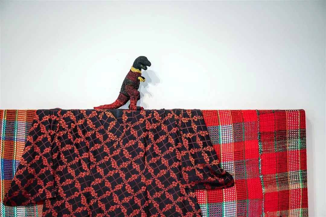 A prominent example is An Exhausted Mother, a sizeable work made up of three major components and exhibited at the Taoyuan City Indigenous Culture Center this year. For this project, Labay created metal frames and prepared ready-made objects such as round tables and a wok, wrapping each of them in handwoven textiles. She then assembled the whole into the shape of a mother. The round tables symbolize the mother’s breasts, while the hand on one of them represents a baby wanting to suckle. Labay says laughingly that the pair of scissors nearby alludes to the mother’s hope that her child will soon be weaned.