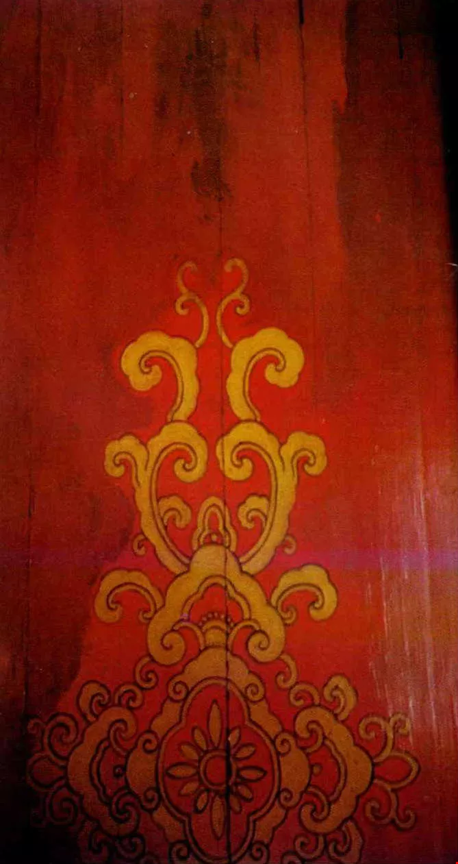 1) This old door still bears traces of paint used in the past. 2) Old door with ancient designs. 3)-5) Carvings and paintings on temple doors.