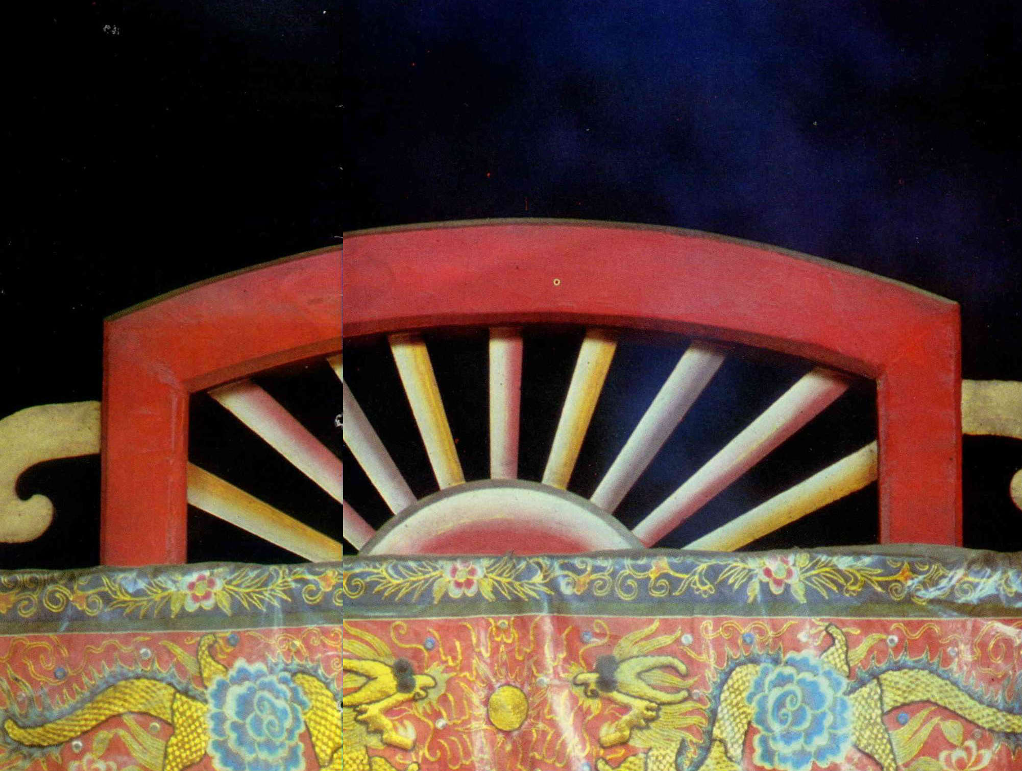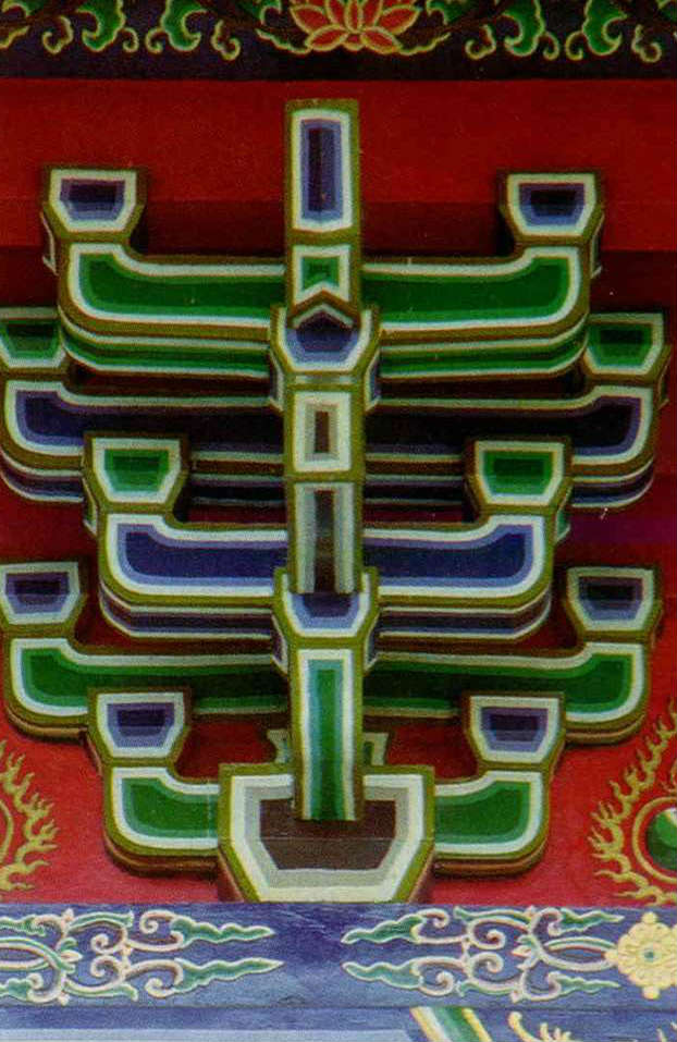 Most of the themes in Chinese art can be found in temples, although the works lack the subtle lines, delicate colors and simplicity of brush strokes found in scroll paintings. Striking colors, such as red, yellow, green, blue and white abound in temple paintings. Deep red predominates because it represents justice and good luck, and is believed to ward off evil influences and assure tranquillity.