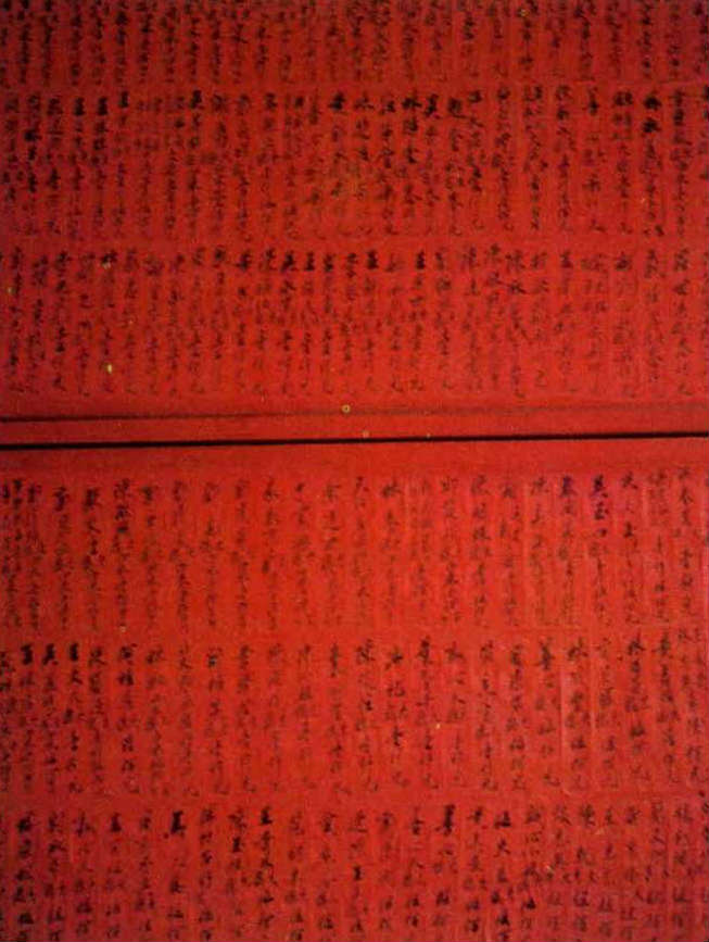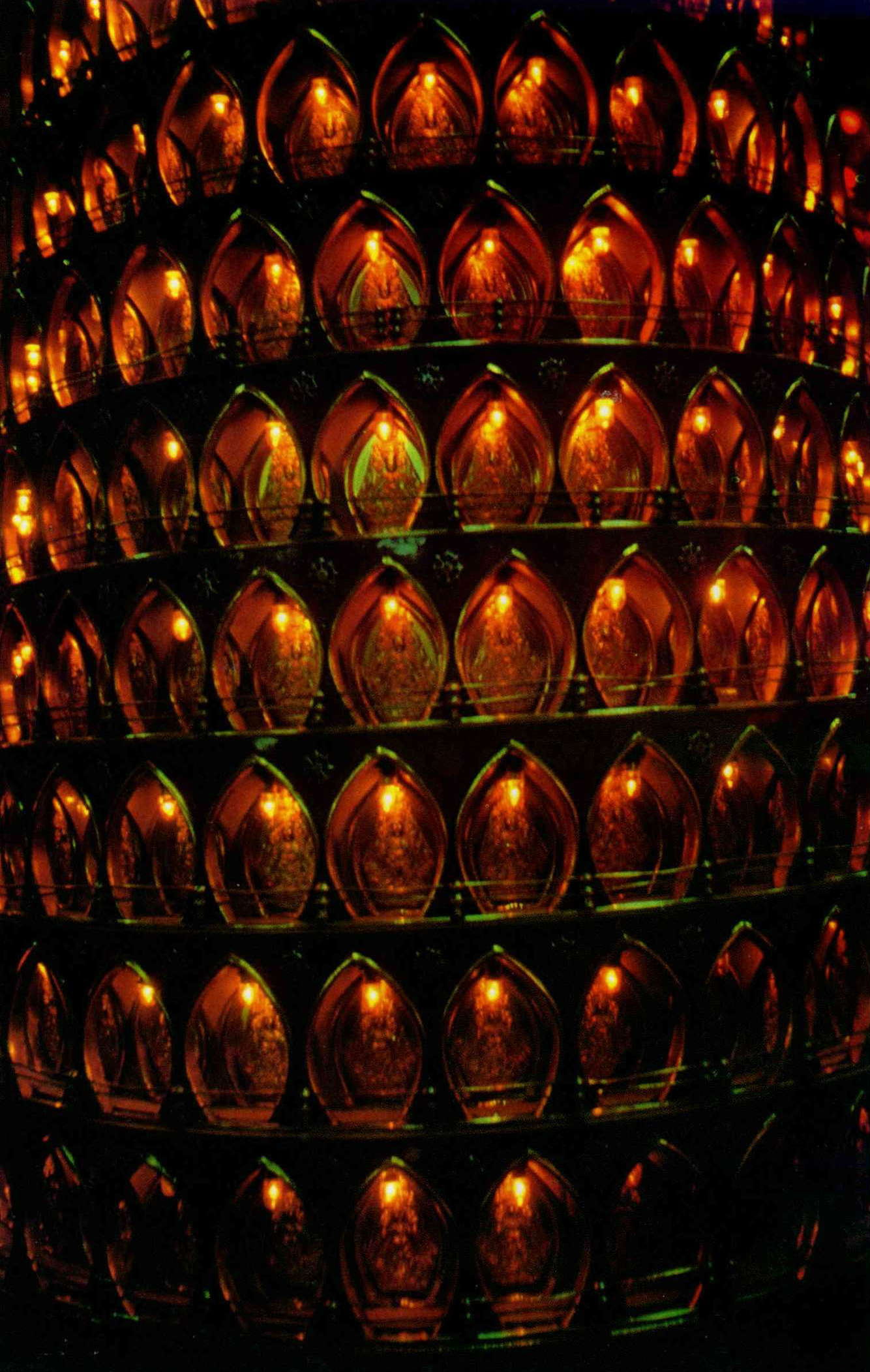 Red candles are donated by the faithful, and red memorial tablets list those who have contributed.