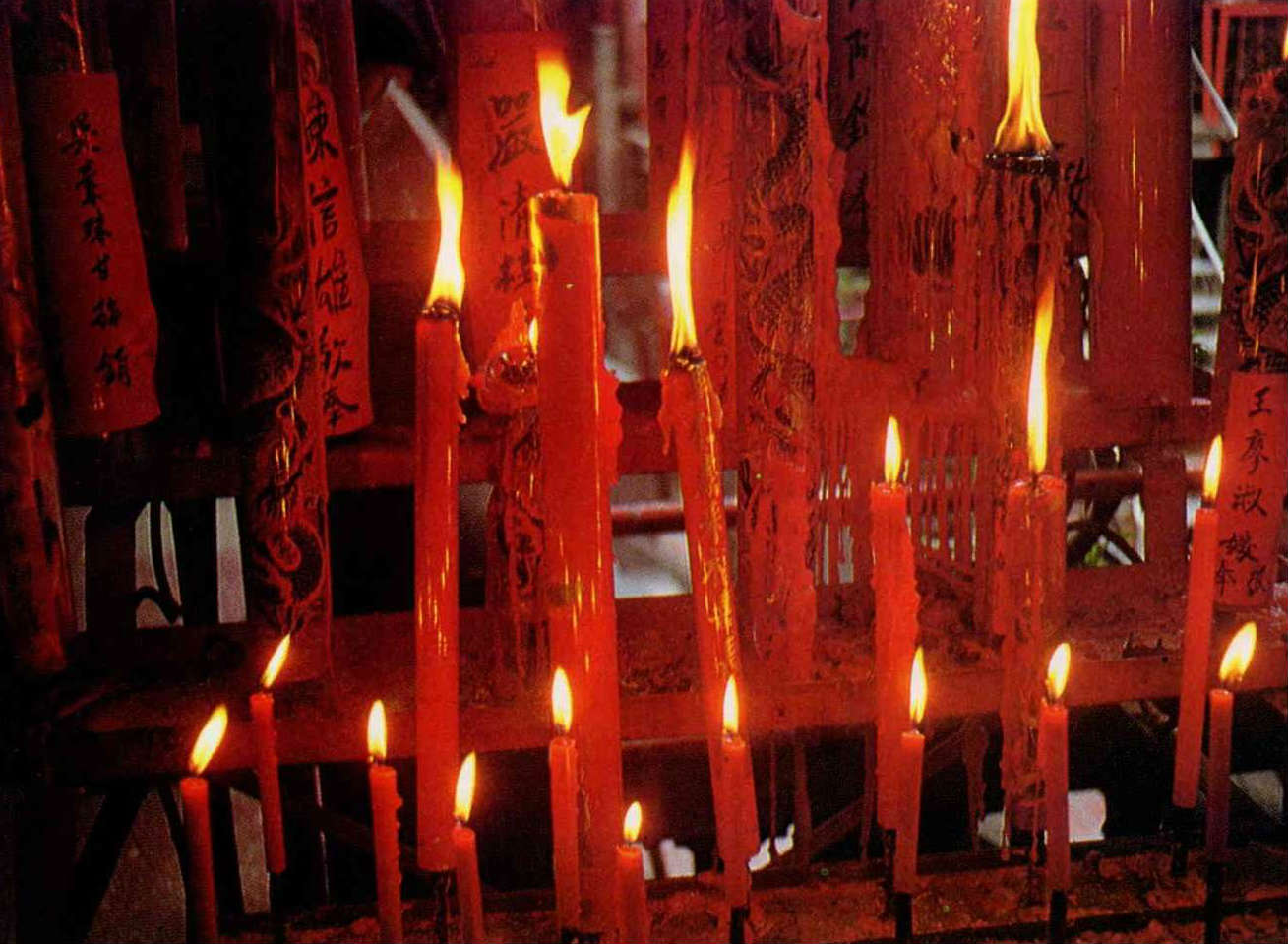 Over the years, the number of colors used increased and the images became more complex. But today, many of the colors have faded, and scenes have changed, as have the worshipers who still crowd the temples. But some things have not changed, such as red pillars with their inscriptions and twinkling lights, and the sincerity of the people who still light candles as they ask the gods to grant their wishes.