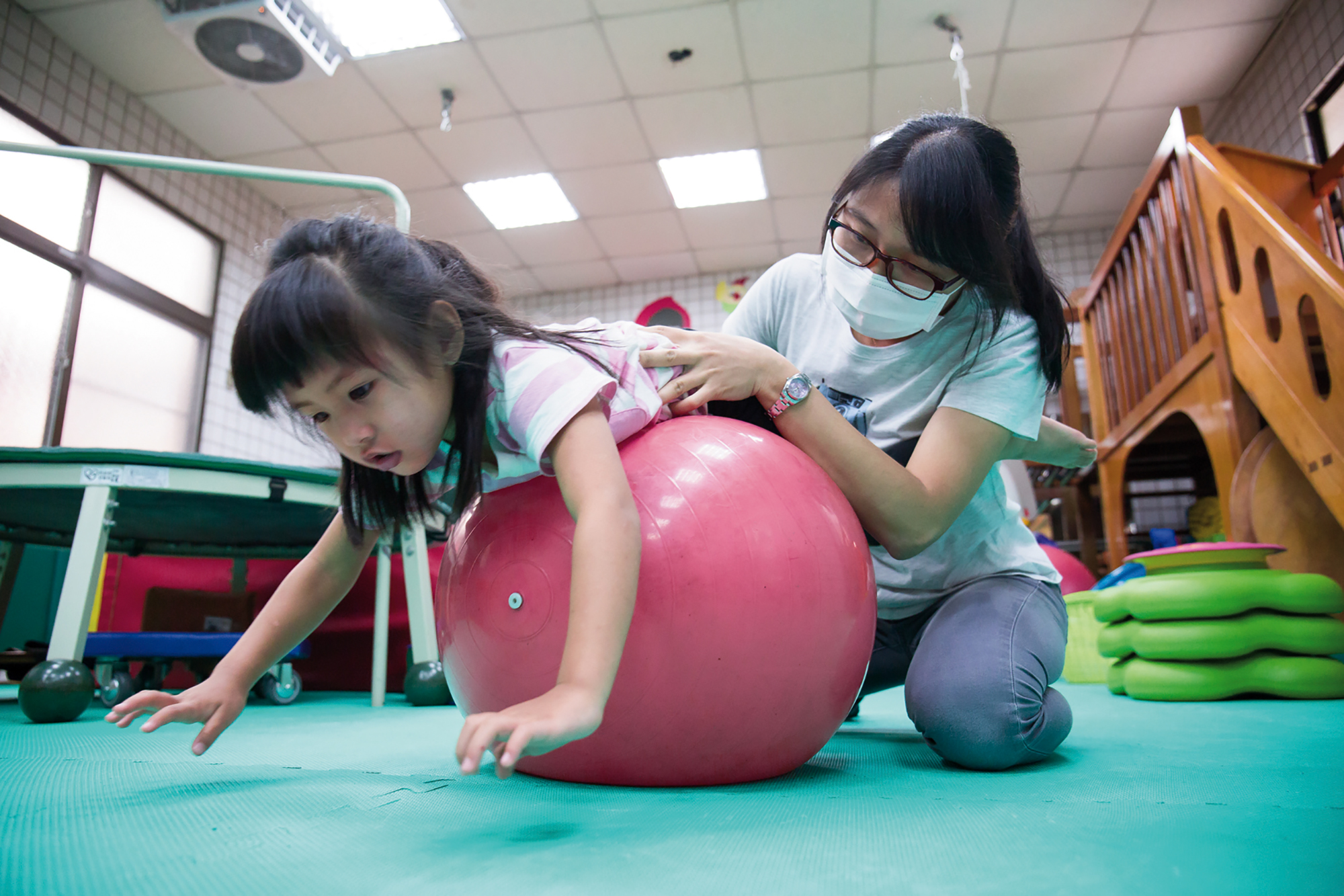 At the center the team assesses each child’s needs and determines an individualized program, which includes one-on-one guidance from an instructor. For example, children may practice a type of ring toss, in which they pedal a tricycle over to a post and place a ring over it; this helps them develop coordination. The children are also taught to exercise large muscle groups by crawling onto slides and then learning to stand upright after sliding down. Watching their children progress, sometimes to the point of joining mainstream kindergartens and growing up alongside other children, fills parents with gratitude.