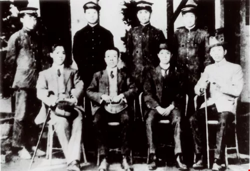 Upset about Yuan Shikai's efforts to harm Sun Yat-sen, Weng Junming (front row, second from left) and Du Congming (third from left) traveled to Beijing intending to infect Yuan with cholera bacteria. They are pictured here with their classmates from Taiwan Governor-General's Medical College. Jiang Weishui is in the back row at the far right.