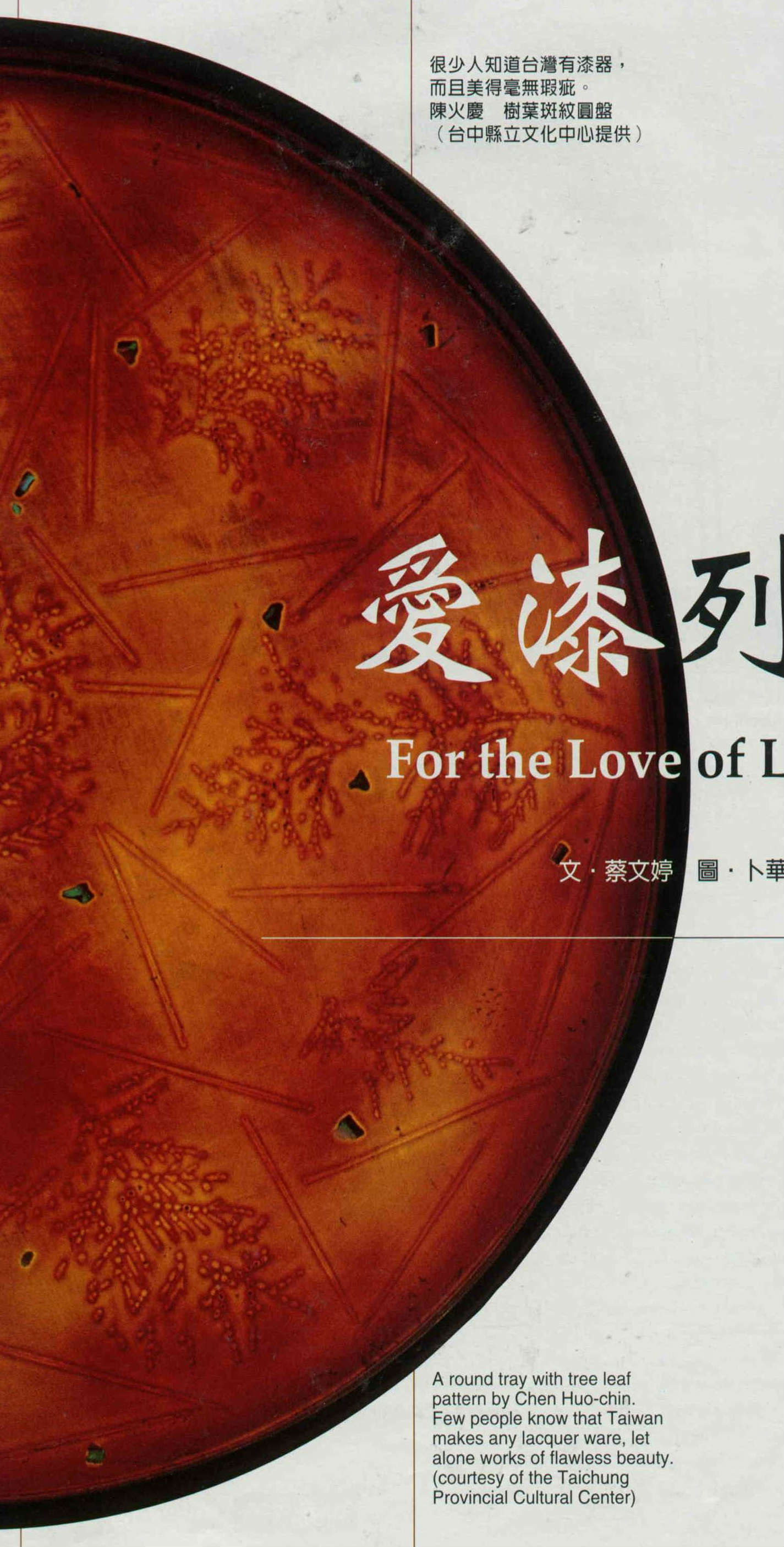 Although the history of lacquer in Taiwan is a short one, these two lacquer lovers have in the separate realms of lacquer production and the craft of making lacquer ware established some "proof positive" of Taiwan's lacquer culture.