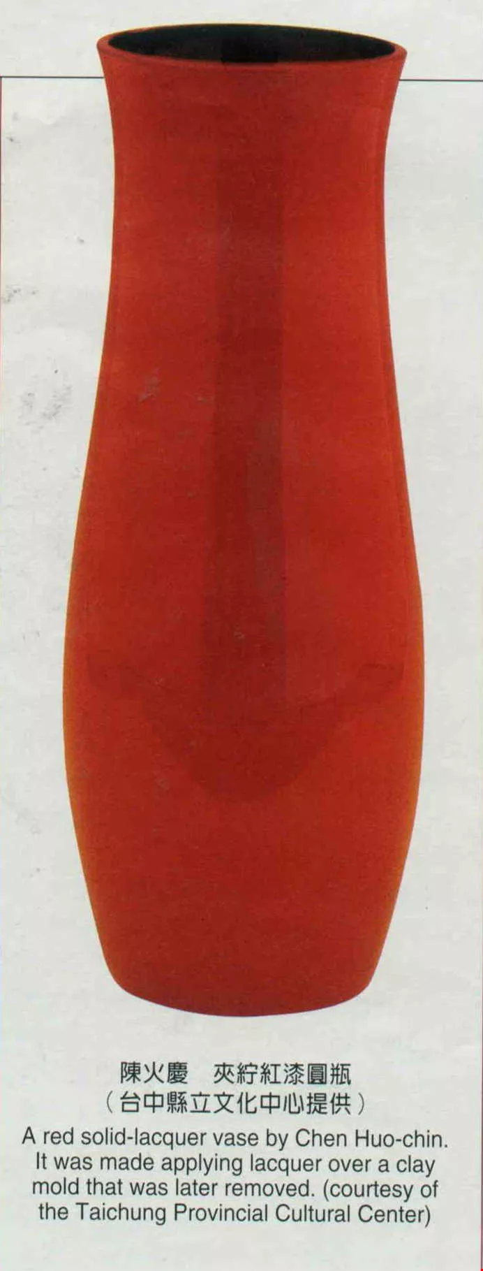 A red solid-lacquer vase by Chen Huo-chin. It was made applying lacquer over a clay mold that was later removed. (courtesy of the Taichung Provincial Cultural Center)