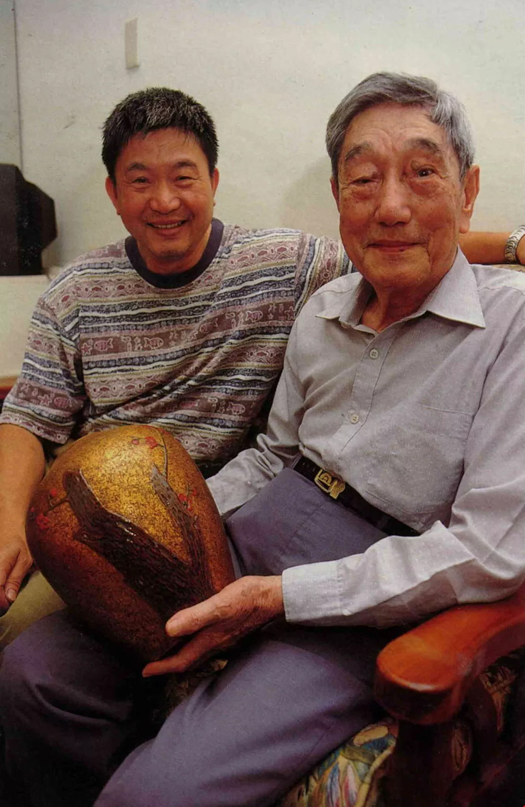 Chen Huo-chin, an old master and lover of lacquer ware, holds one of his favorite pieces, a golden vase with an old plum tree in bloom. It's a lot like himself, old but still budding flowers of creativity. Chen's third son Chih-ming, who is owner of a lacquer ware exporting firm, sits next to him.