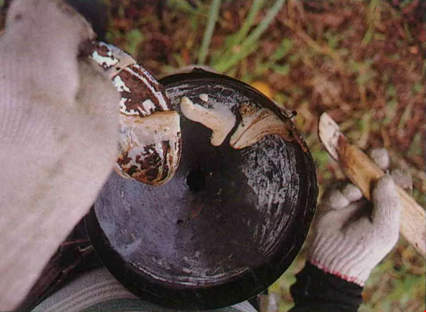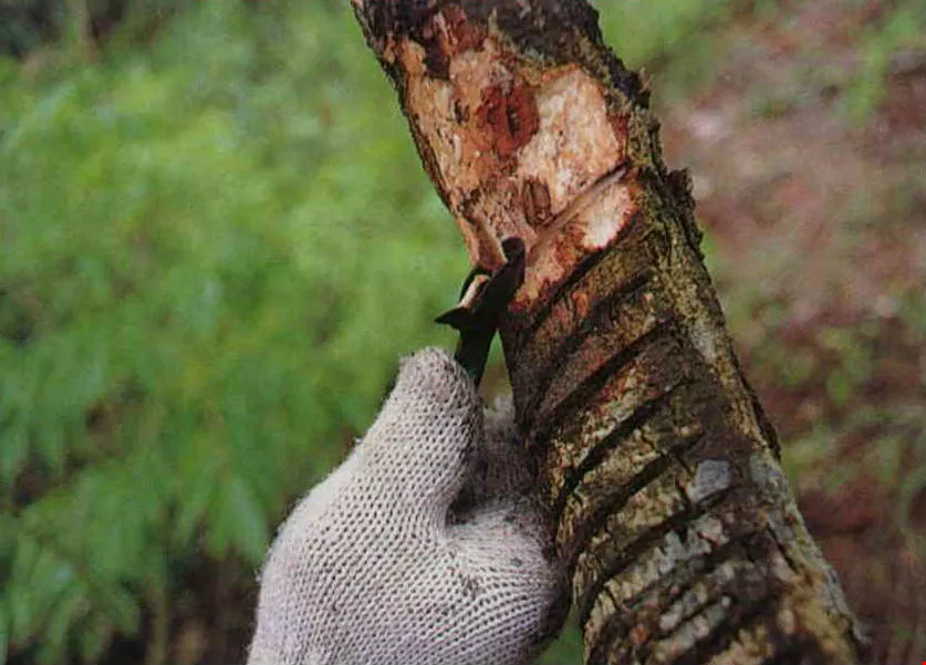 The harvesting of raw lacquer: First the tapper hacks into a lacquer tree. Then he places a shell into the cut and waits for sap to flow into the shell. Finally he uses a spatula to scrape every last drop of sap out of the shell.