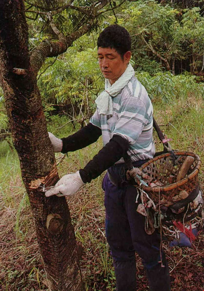 In Taiwan the season for tapping lacquer trees runs from April to November. Because the flow is greatly diminished once the sun is out, the work of tapping lacquer trees is done in the wee hours of the morning. Tappers wear small flashlights on their foreheads. On their backs they lug tool boxes filled with various sorts of knives and hatchets, and pails for catching the lacquer sap. Groping their ways up slopes in the dark, they are best off taking along mosquito coils to burn. Otherwise, the mountain mosquitoes can bite right through their pants.