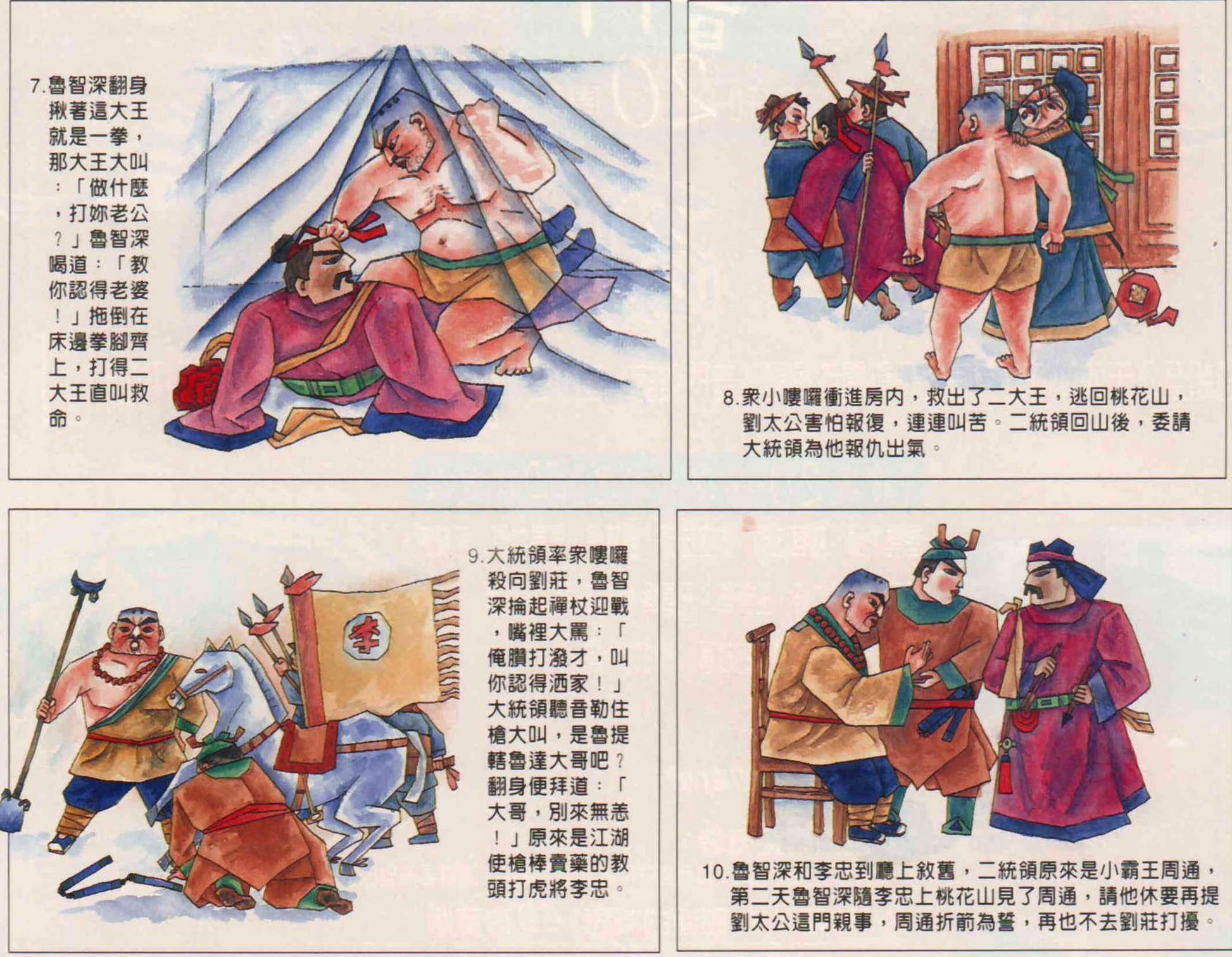 7 Lu Zhishen answered the bandit with a whack. "Hey!" yelped the bandit, "What was that for?" Lu bellowed back: "I'll teach you to show your old lady some respect!" With that he knocked the bandit to the floor, and beat him until he wailed for mercy.