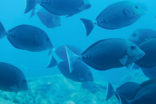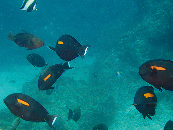 Scalpel sawtail (Prionurus scalprum) Habitats: Dense coral areas and rocky reefs. Adult fish migrate between reefs in large schools.