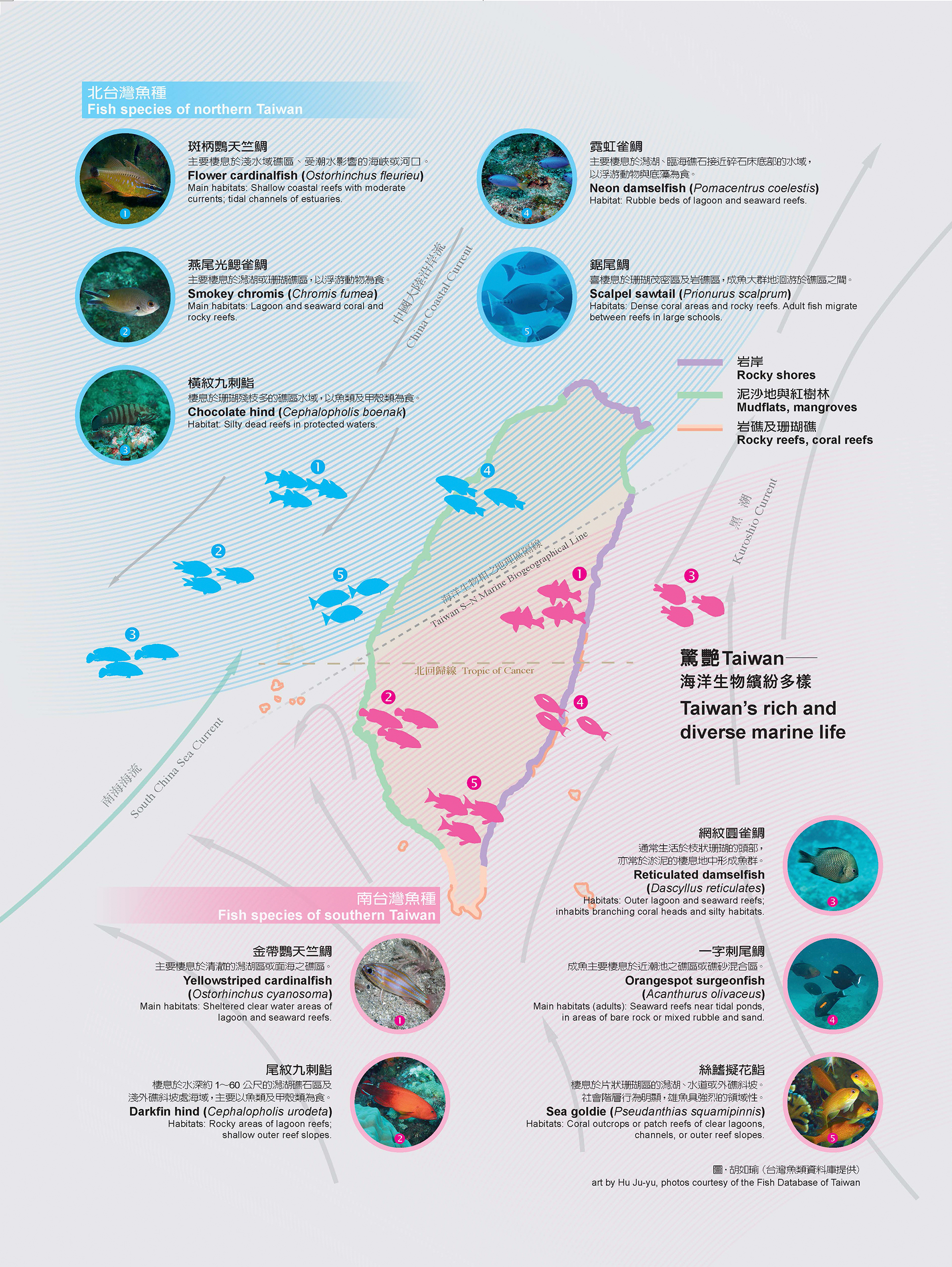 Taiwan is located at the northern edge of the “Coral Triangle,” an area of tropical seas with many islands and extraordinary levels of biodiversity. It is at the point of intersection of three “large marine ecosystems”: those of the East China Sea, the South China Sea, and the Philippine Sea. It is also the meeting point of three ocean currents: the Kuroshio Current, the China Coastal Current, and the South China Sea Current. And it has diverse marine habitats. All these are important factors in giving shape to different ecosystems that create its rich biodiversity.