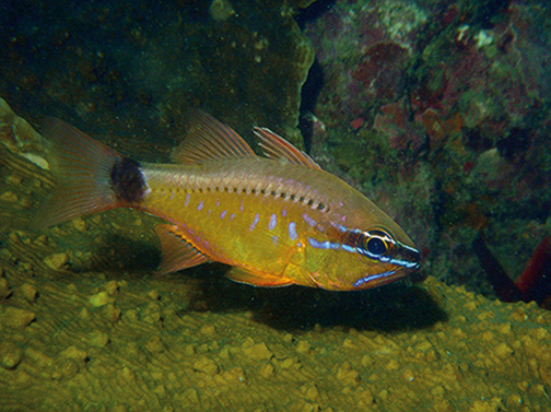 Yellowstriped cardinalfish (Ostorhinchus cyanosoma) Main habitats: Sheltered clear water areas of lagoon and seaward reefs.