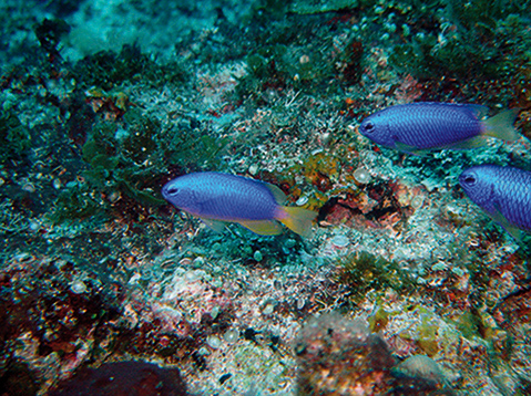 Neon damselfish (Pomacentrus coelestis) Habitat: Rubble beds of lagoon and seaward reefs.