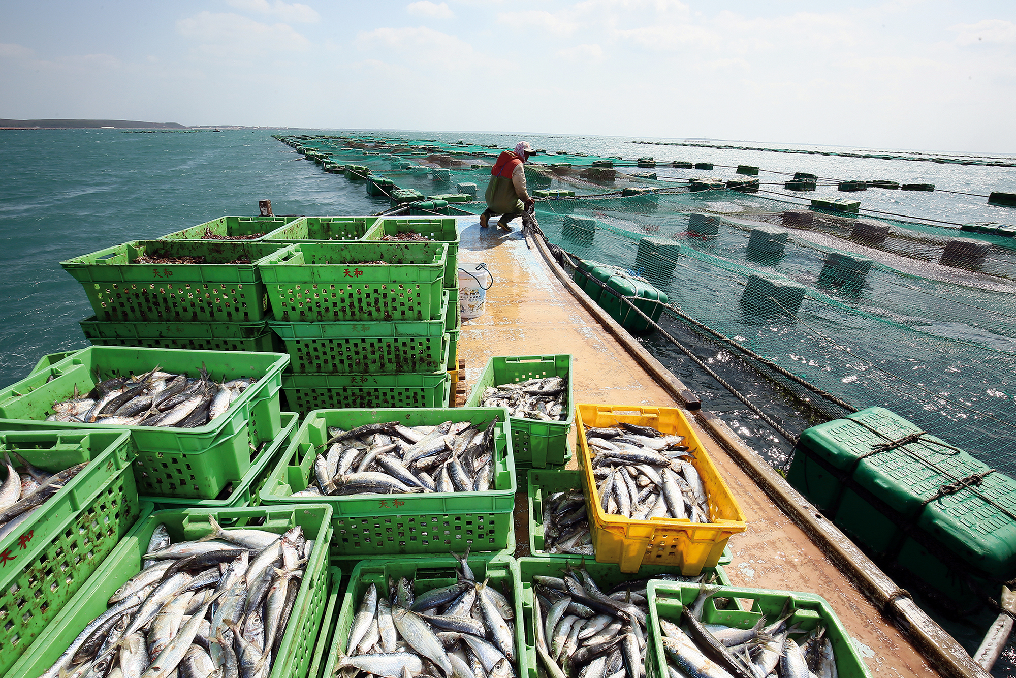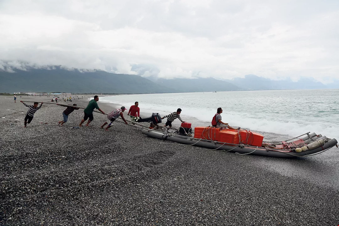 Fishermen prepare to set off on a pipe boat from Hualien's Qixingtan Beach to harvest fish from nearby fixed nets. This is a sustainable method of fishing.