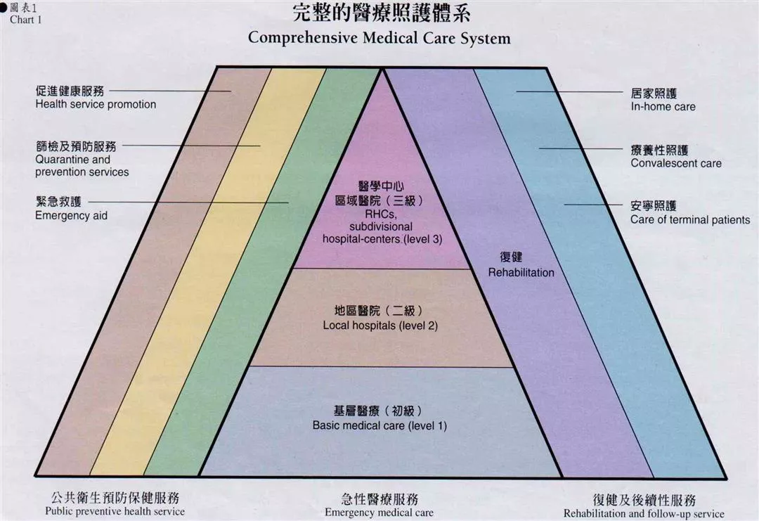 In terms of treatment of acute disorders, on the one hand, it is necessary to lessen the disparity between urban and rural areas; on the other, a hierarchical medical care system must be developed, including basic medical care that covers the greatest possible area, second-level local medical care, and top-level regional hospital-centers (RHCs) and subdivisional hospital-centers (SHCs), where complicated technology is a staple. The goal is delegating small hospitals for small ailments and big hospitals for big ailments. Aside from the network's structure, early preventive medical care, follow-up rehabilitation, and care of chronic diseases are of equal importance. Only with the three programs in balance can they bear the heavy burden of universal health insurance (see Chart 1).