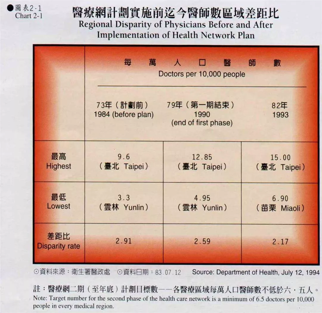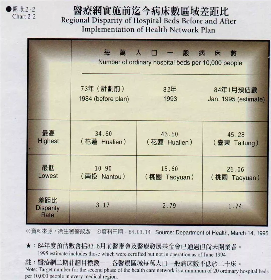 In terms of the average distribution of medical resources among urban and rural areas, Taiwan's current efficiency provokes a sense of pride. In the 63 health care districts throughout Taiwan, which are divided according to commuting patterns, only nine districts still fall in the category of "lacking medical resources." Most of these are remote mountainous areas or offshore islands. This constitutes a significant improvement from when health care network development was instigated, when 17 districts had insufficient medical resources.