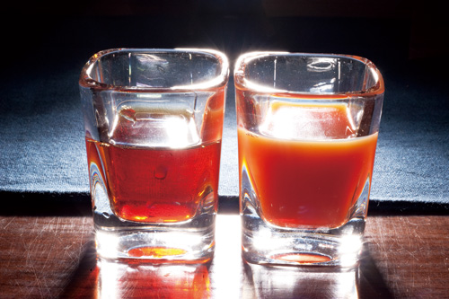 A good black tea has a strong astringent flavor, and the amber, transparent brew (left) starts to emulsify after cooling, becoming turbid (right).