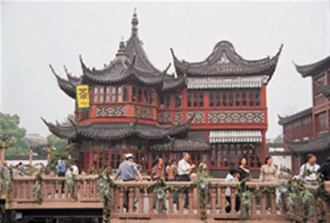 This tea house in the Yuyuan Gardens is two hundred years old. Visitors can admire the view from the zig-zag footbridge.