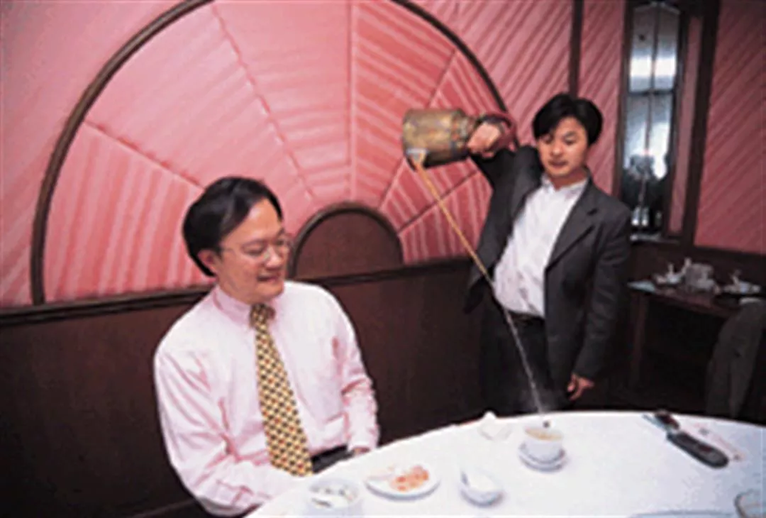 Elegant tea service is the boast of many a Shanghai restaurant. At left in the photo is Taiwan businessman Bruce Wang, head of Elegant Molecular Sieves.