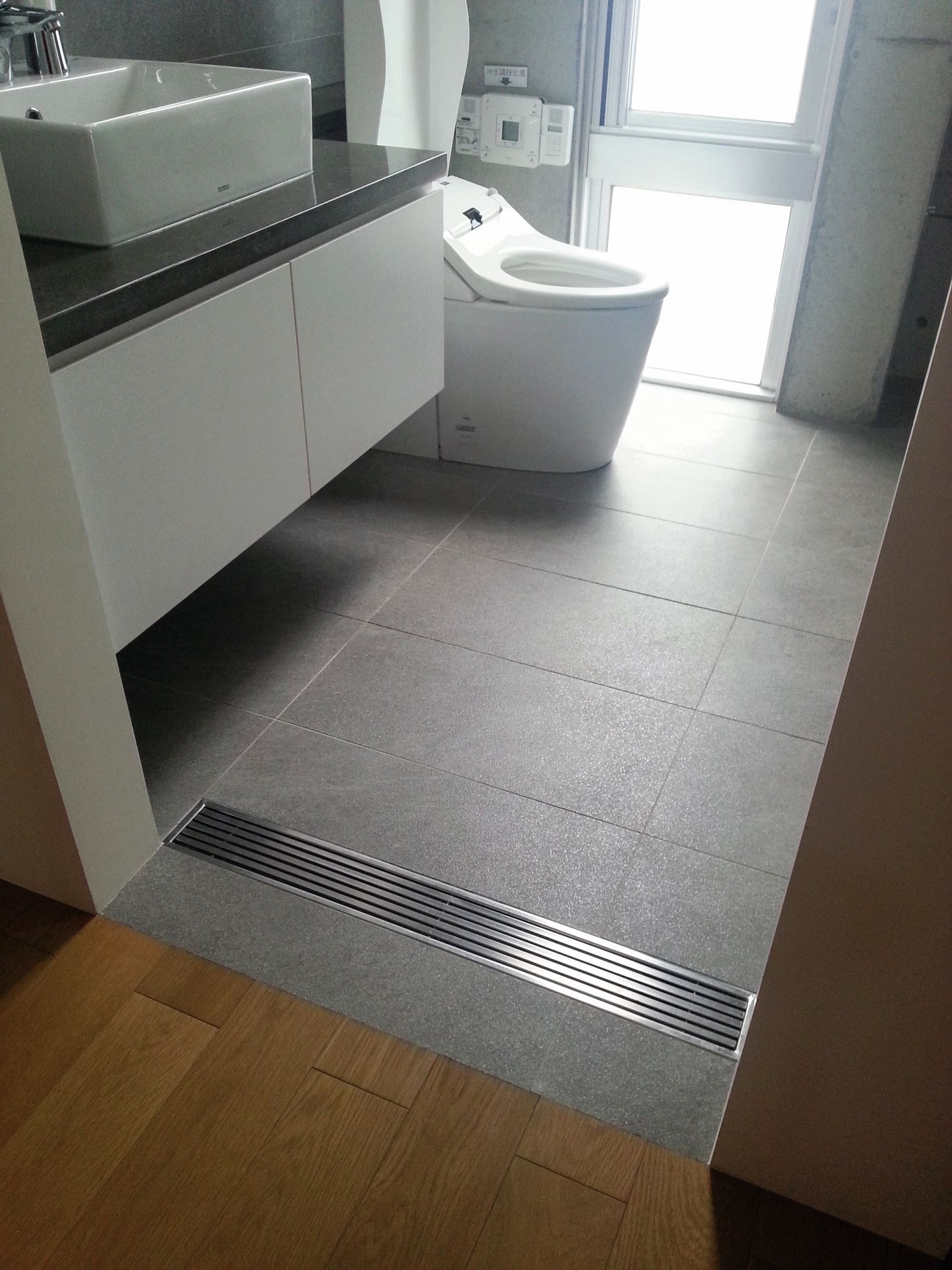 Ordinary bathrooms usually have a raised threshold to keep water inside. Handicapped-friendly bathrooms use a gutter instead, reducing the height differential with the adjoining room and making them more accessible. (courtesy of the Lantan Garden design team)