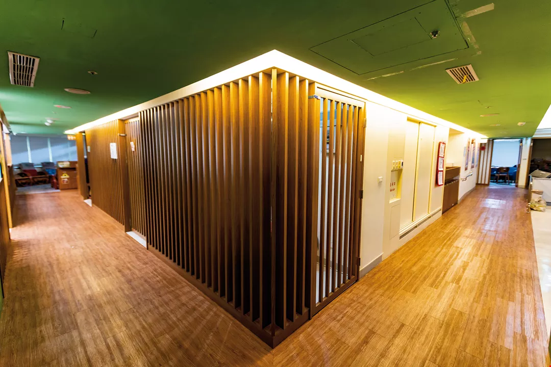 Seniors with dementia are also subject to fantasies and delusions, and sometimes try to flee, so daycare centers often hide the doors. Here, Lin reduced the number of runaways by using a kind of vertical lattice fencing common in the Beitou Hot Springs district to conceal the glass exterior doors.