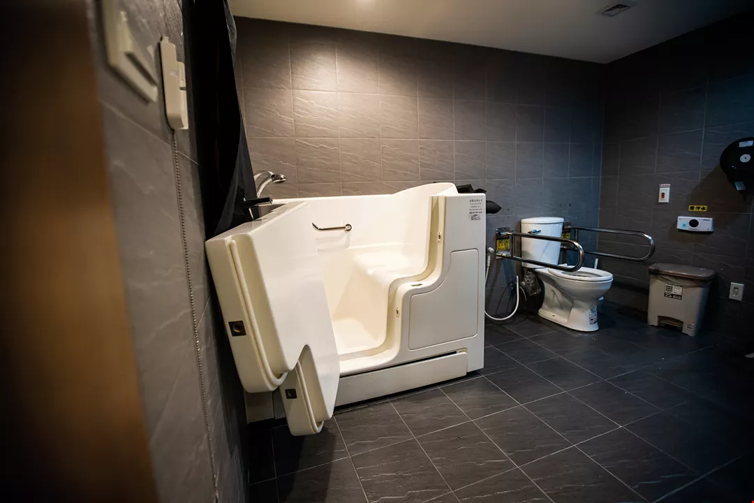 Because seniors with dementia and physical disabilities often suffer from incontinence, long-term care centers are always equipped with showers. This one also features a walk-in bathtub that makes it easier for wheelchair users to clean up.