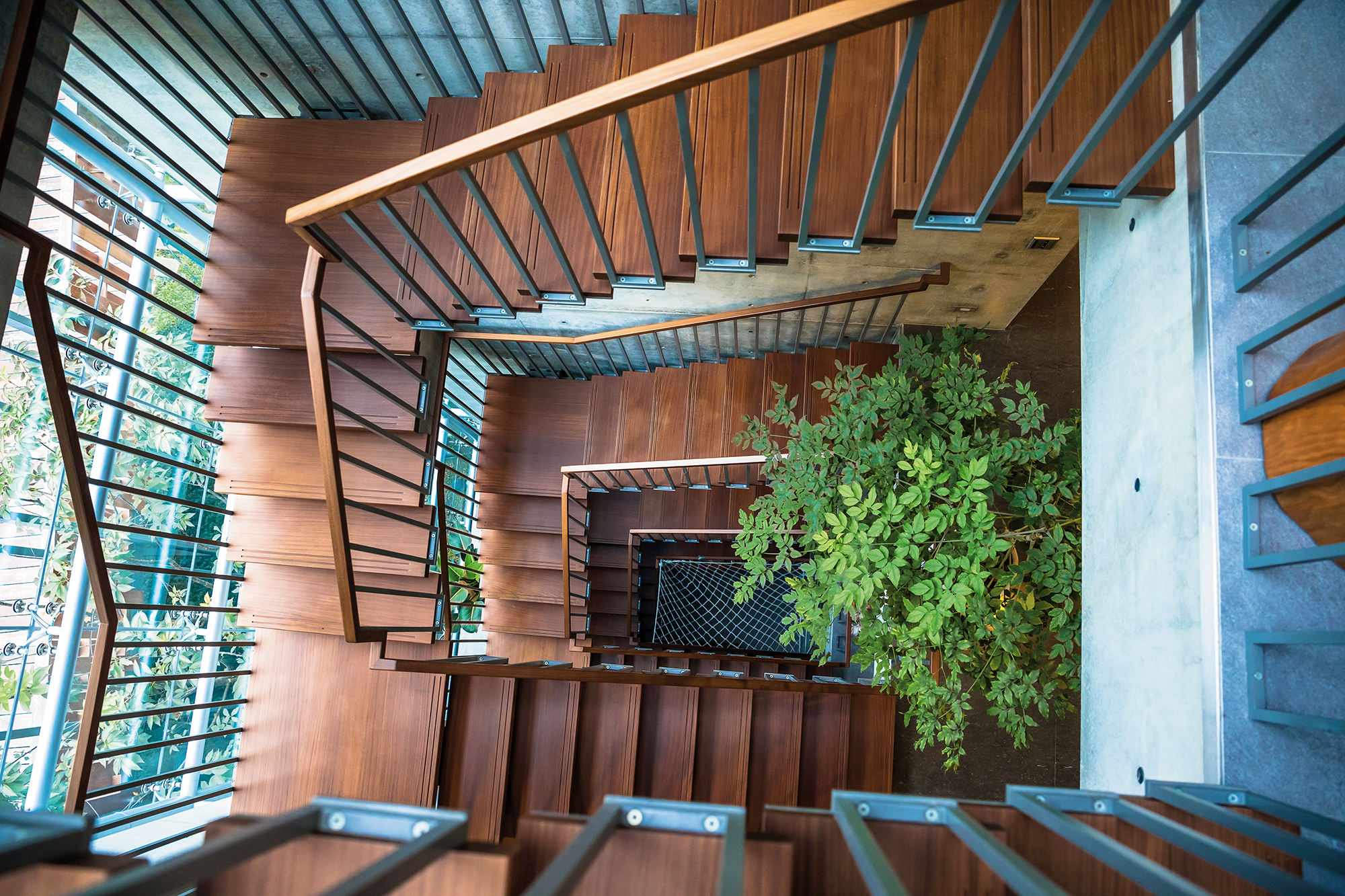 The interior stairway also functions as a buoyancy ventilation tower, drawing warm interior air up and out through self-venting windows at the top.