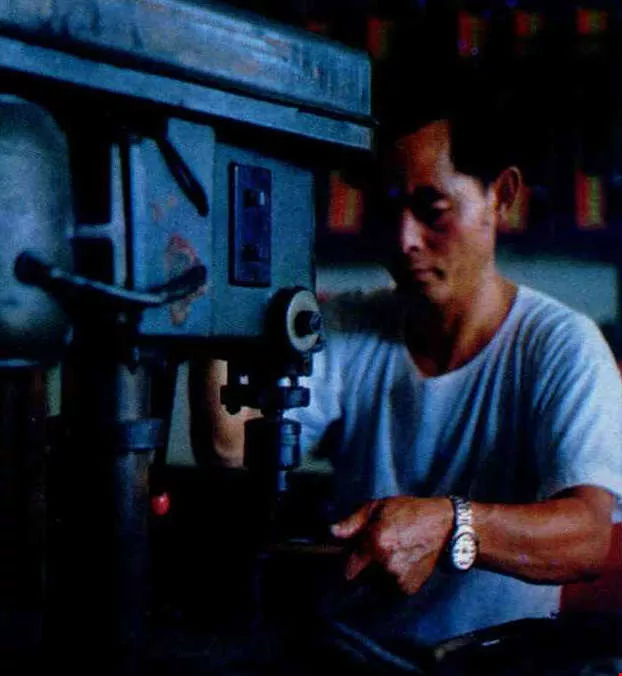 First produced a century ago in the Taipei suburb of Shihlin, the model is known as the Shihlin knife, or Pa Chih Lang knife, after the former name of Shihlin. When Shihlin was the center of knife production for the entire island of Taiwan some 25 years ago, cutlery workshops lined all the main streets of the district. Now, only the Shihlin Custom Cutlery Corp. remains as a large-scale manufacturer, run by Chiu Chien-chih and his son, representing the third and fourth generations in a 60-year dynasty of cutlery makers. It is said that the Shihlin knife was first invented some 100 years ago by a locksmith who immigrated to Taiwan from Kwangtung. Of all the old master's apprentices who later passed on the skill from generation to generation, Chiu was regarded as one of the most outstanding.